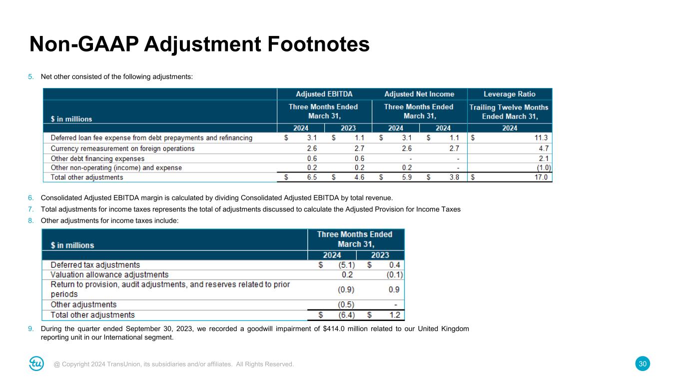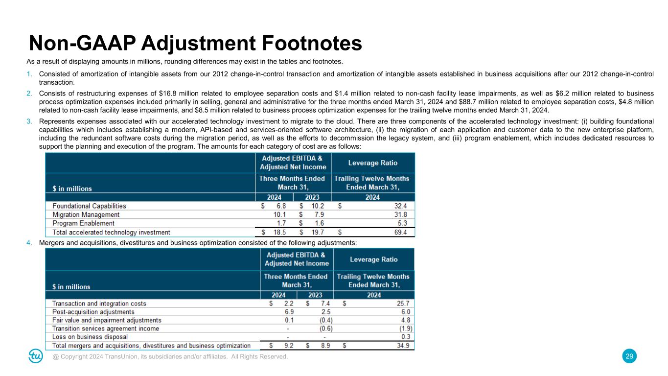 29@ Copyright 2024 TransUnion, its subsidiaries and/or affiliates. All Rights Reserved. Non-GAAP Adjustment Footnotes As a result of displaying amounts in millions, rounding differences may exist in the tables and footnotes. 1. Consisted of amortization of intangible assets from our 2012 change-in-control transaction and amortization of intangible assets established in business acquisitions after our 2012 change-in-control transaction. 2. Consists of restructuring expenses of $16.8 million related to employee separation costs and $1.4 million related to non-cash facility lease impairments, as well as $6.2 million related to business process optimization expenses included primarily in selling, general and administrative for the three months ended March 31, 2024 and $88.7 million related to employee separation costs, $4.8 million related to non-cash facility lease impairments, and $8.5 million related to business process optimization expenses for the trailing twelve months ended March 31, 2024. 3. Represents expenses associated with our accelerated technology investment to migrate to the cloud. There are three components of the accelerated technology investment: (i) building foundational capabilities which includes establishing a modern, API-based and services-oriented software architecture, (ii) the migration of each application and customer data to the new enterprise platform, including the redundant software costs during the migration period, as well as the efforts to decommission the legacy system, and (iii) program enablement, which includes dedicated resources to support the planning and execution of the program. The amounts for each category of cost are as follows: 4. Mergers and acquisitions, divestitures and business optimization consisted of the following adjustments: