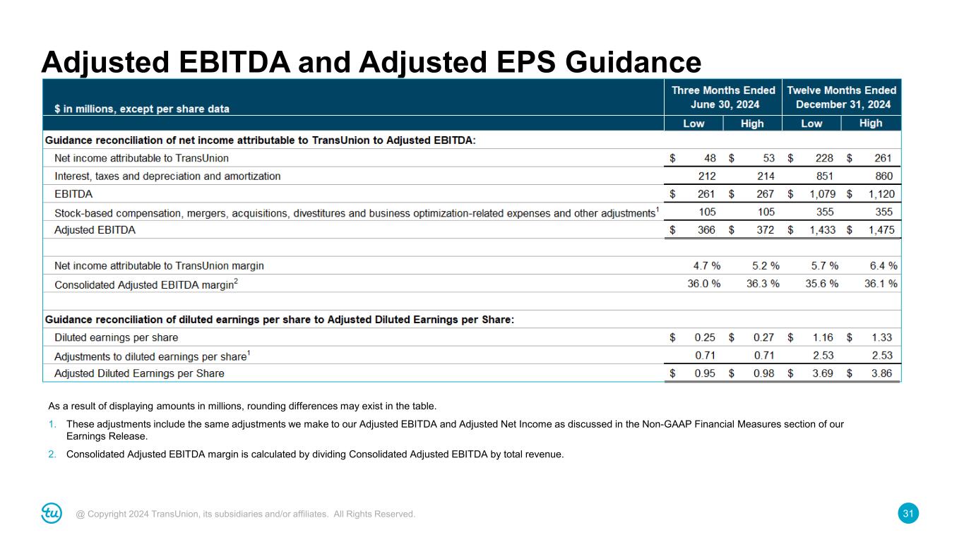 31@ Copyright 2024 TransUnion, its subsidiaries and/or affiliates. All Rights Reserved. Adjusted EBITDA and Adjusted EPS Guidance As a result of displaying amounts in millions, rounding differences may exist in the table. 1. These adjustments include the same adjustments we make to our Adjusted EBITDA and Adjusted Net Income as discussed in the Non-GAAP Financial Measures section of our Earnings Release. 2. Consolidated Adjusted EBITDA margin is calculated by dividing Consolidated Adjusted EBITDA by total revenue.