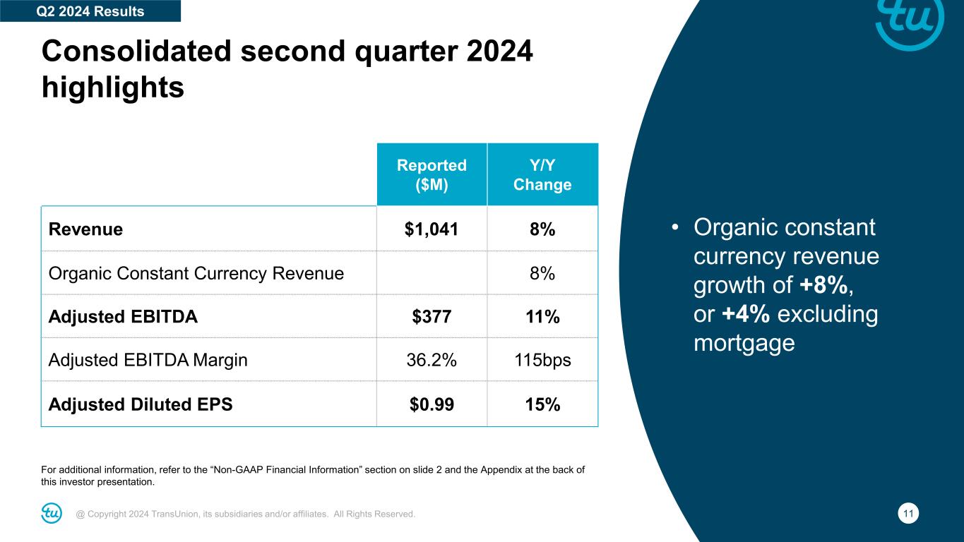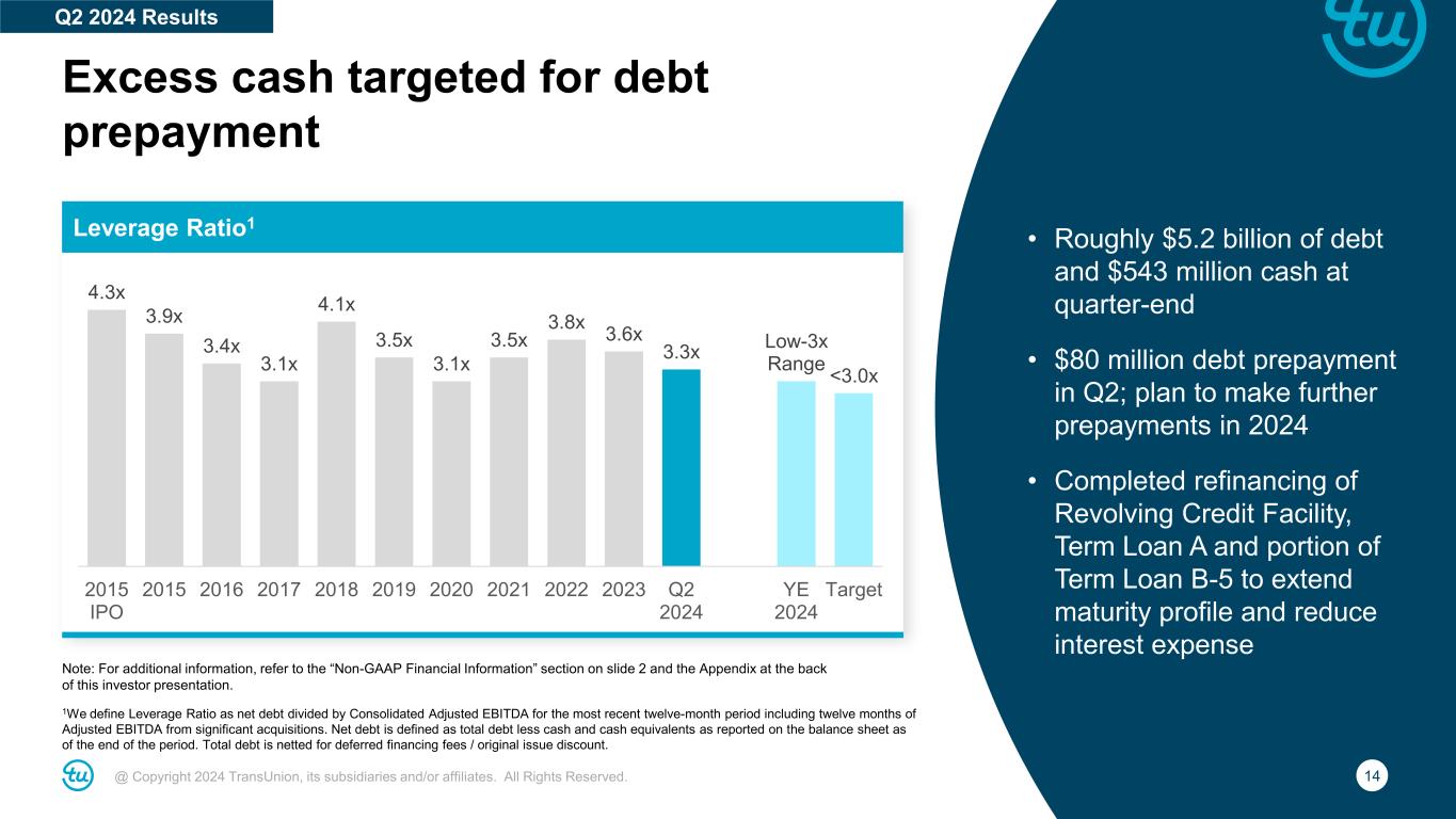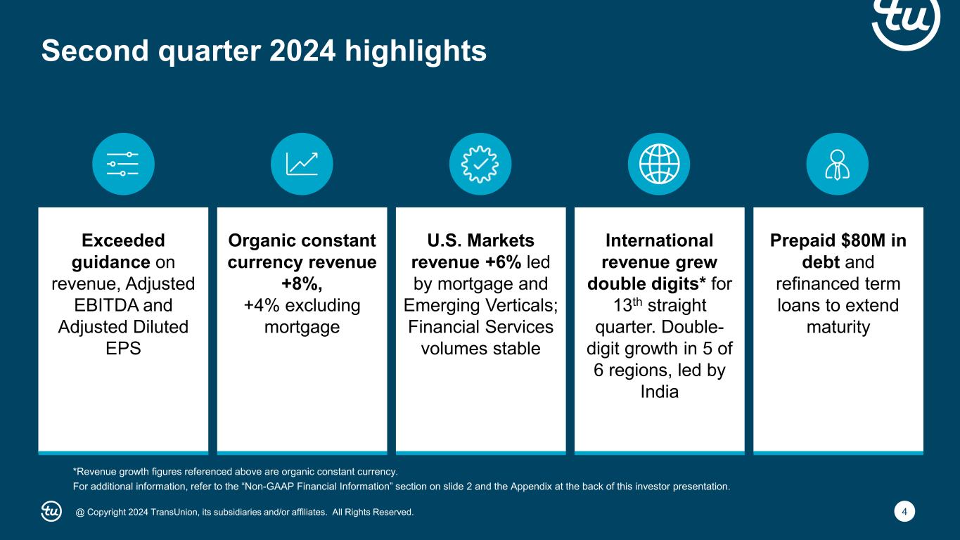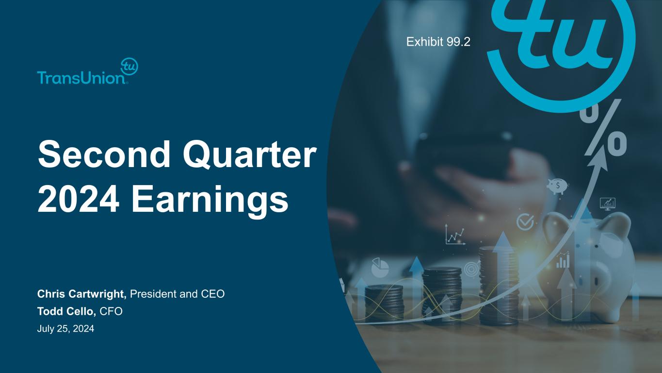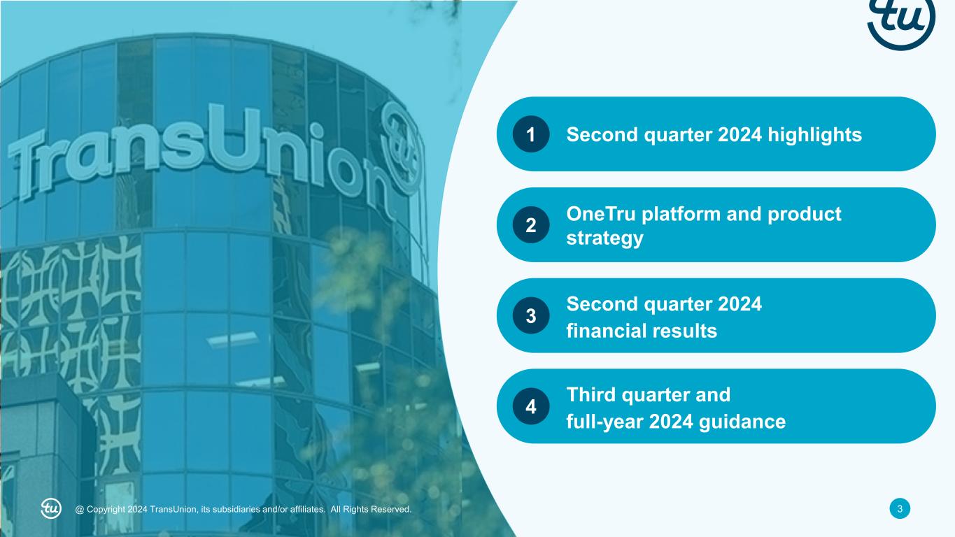 2@ Copyright 2024 TransUnion, its subsidiaries and/or affiliates. All Rights Reserved. Non-GAAP Financial InformationForward-Looking Statements This presentation contains forward-looking statements within the meaning of the Private Securities Litigation Reform Act of 1995. These statements are based on the current beliefs and expectations of TransUnion’s management and are subject to significant risks and uncertainties. Actual results may differ materially from those described in the forward-looking statements. Factors that could cause TransUnion’s actual results to differ materially from those described in the forward-looking statements include: macroeconomic effects and changes in market conditions, including the impact of inflation, risk of recession and industry trends and adverse developments in the debt, consumer credit and financial services markets, including the impact on the carrying value of our assets in all of the markets where we operate; our ability to provide competitive services and prices; our ability to retain or renew existing agreements with large or long-term customers; our ability to maintain the security and integrity of our data; our ability to deliver services timely without interruption; our ability to maintain our access to data sources; government regulation and changes in the regulatory environment; litigation or regulatory proceedings; our ability to effectively manage our costs; our efforts to execute our transformation plan and achieve the anticipated benefits and savings; our ability to remediate existing material weakness in internal control over financial reporting and maintain effective internal control over financial reporting and disclosure controls and procedures; economic and political stability in the United States and international markets where we operate; our ability to effectively develop and maintain strategic alliances and joint ventures; our ability to timely develop new services and the market’s willingness to adopt our new services; our ability to manage and expand our operations and keep up with rapidly changing technologies; our ability to acquire businesses, successfully secure financing for our acquisitions, timely consummate our acquisitions, successfully integrate the operations of our acquisitions, control the costs of integrating our acquisitions and realize the intended benefits of such acquisitions; our ability to protect and enforce our intellectual property, trade secrets and other forms of unpatented intellectual property; geopolitical conditions and other risks associated with our international operations; risks related to our indebtedness, including our ability to make timely payments of principal and interest and our ability to satisfy covenants in the agreements governing our indebtedness; our ability to maintain our liquidity; and other one-time events and other factors that can be found in our Annual Report on Form 10-K for the year ended December 31, 2023, and any subsequent Quarterly Report on Form 10-Q or Current Report on Form 8-K, which are filed with the Securities and Exchange Commission and are available on TransUnion’s website (www.transunion.com/tru) and on the Securities and Exchange Commission’s website (www.sec.gov). TransUnion undertakes no obligation to publicly release the result of any revisions to these forward-looking statements to reflect the impact of events or circumstances that may arise after the date of this presentation. This investor presentation includes certain non-GAAP measures that are more fully described in the appendices to the presentation. Exhibit 99.1, “Press release of TransUnion dated July 25, 2024, announcing results for the quarter ended June 30, 2024,” under the heading ‘Non-GAAP Financial Measures,’” furnished to the Securities and Exchange Commission on July 25, 2024. These financial measures should be reviewed in conjunction with the relevant GAAP financial measures and are not presented as alternative measures of GAAP. Other companies in our industry may define or calculate these measures differently than we do, limiting their usefulness as comparative measures. Because of these limitations, these non-GAAP financial measures should not be considered in isolation or as substitutes for performance measures calculated in accordance with GAAP. Reconciliations of these non-GAAP financial measures to their most directly comparable GAAP financial measures for each of the periods included in this presentation are included in the Appendices at the back of this investor presentation.