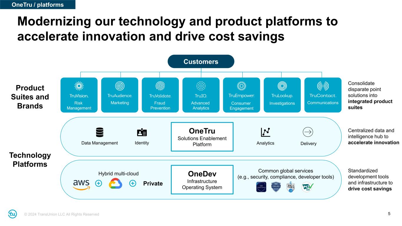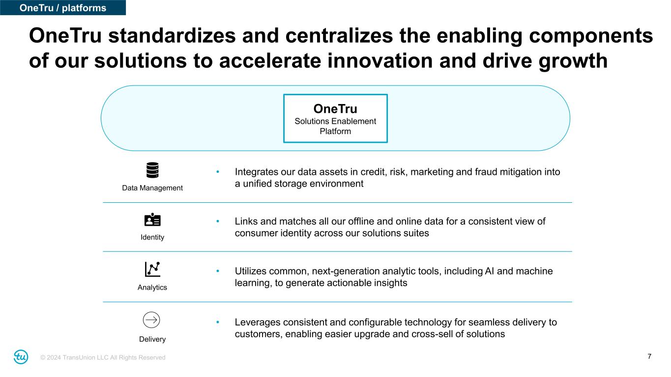 © 2024 TransUnion LLC All Rights Reserved 6 OneDev rationalizes our technology foundation and provides standard developer tools for productivity and savings OneDev Infrastructure Operating System Private Hybrid multi-cloud • Provides a hybrid multi-cloud infrastructure to support different workloads and prevent supplier lock-in​ • Enables data center consolidation and eliminates unnecessary technology variations Common global services • Standardizes common software development utilities such as data security, compliance, and developer toolsets​ • Improves developer experience through unified operational control plane and self-service in cloud​ • Rationalizes third-party software spend and legacy technology costs OneTru / platforms