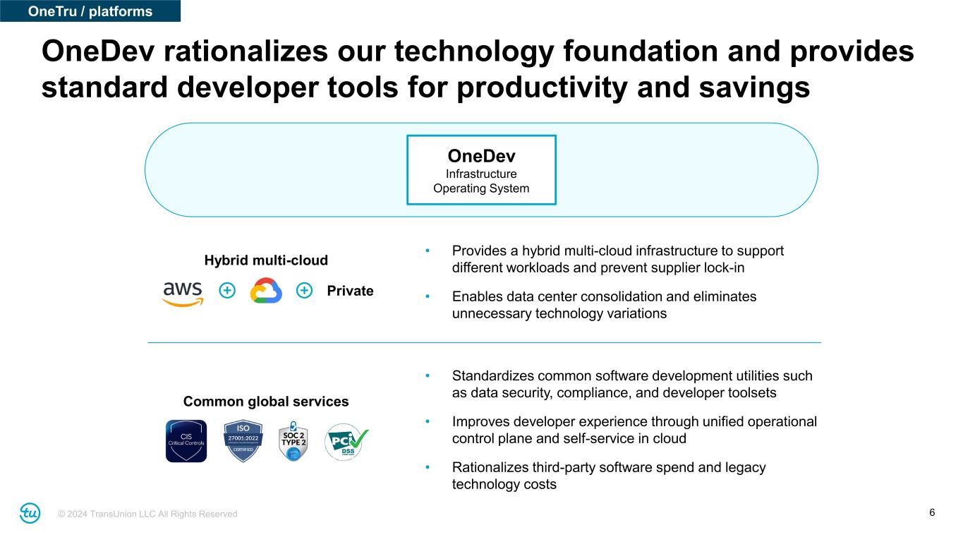 © 2024 TransUnion LLC All Rights Reserved 5 Modernizing our technology and product platforms to accelerate innovation and drive cost savings Risk Management Marketing CommunicationsInvestigationsConsumer Engagement Fraud Prevention Product Suites and Brands Technology Platforms Advanced Analytics Standardized development tools and infrastructure to drive cost savings Centralized data and intelligence hub to accelerate innovationData Management AnalyticsIdentity Delivery Private Hybrid multi-cloud Common global services (e.g., security, compliance, developer tools) OneTru Solutions Enablement Platform OneDev Infrastructure Operating System Consolidate disparate point solutions into integrated product suites Customers OneTru / platforms
