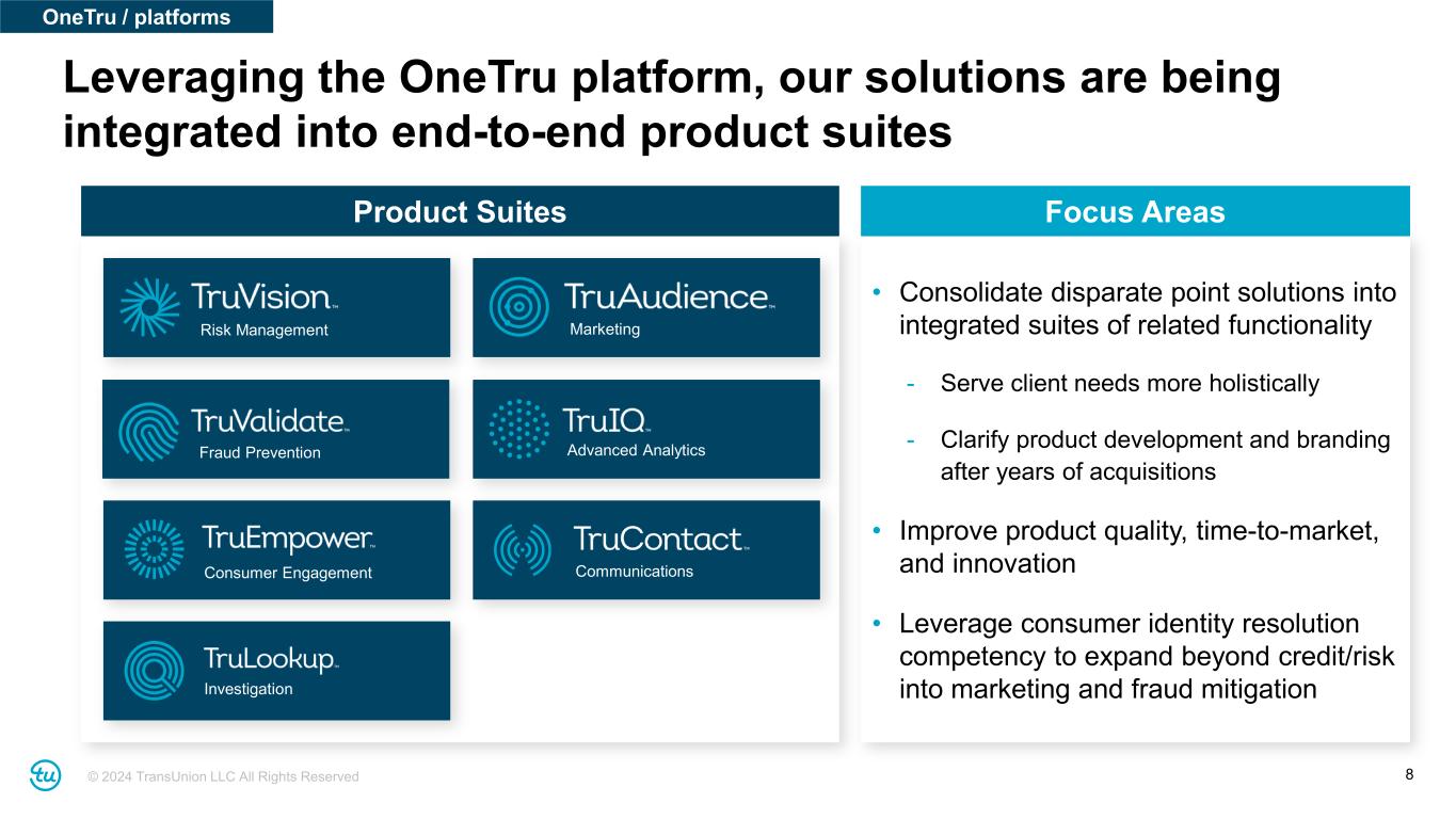 © 2024 TransUnion LLC All Rights Reserved 7 OneTru standardizes and centralizes the enabling components of our solutions to accelerate innovation and drive growth OneTru / platforms Data Management Identity Analytics Delivery OneTru Solutions Enablement Platform • Integrates our data assets in credit, risk, marketing and fraud mitigation into a unified storage environment • Links and matches all our offline and online data for a consistent view of consumer identity across our solutions suites​ • Utilizes common, next-generation analytic tools, including AI and machine learning, to generate actionable insights​ • Leverages consistent and configurable technology for seamless delivery to customers, enabling easier upgrade and cross-sell of solutions​