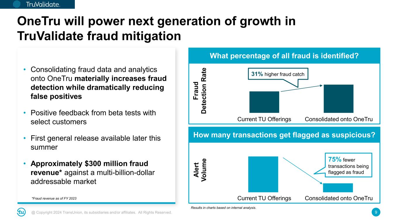 © 2024 TransUnion LLC All Rights Reserved 8 Leveraging the OneTru platform, our solutions are being integrated into end-to-end product suites​ Product Suites Fraud Prevention MarketingRisk Management Advanced Analytics Consumer Engagement Investigation Communications Focus Areas • Consolidate disparate point solutions into integrated suites of related functionality - Serve client needs more holistically​ - Clarify product development and branding after years of acquisitions • Improve product quality, time-to-market, and innovation​ • Leverage consumer identity resolution competency to expand beyond credit/risk into marketing and fraud mitigation​ OneTru / platforms