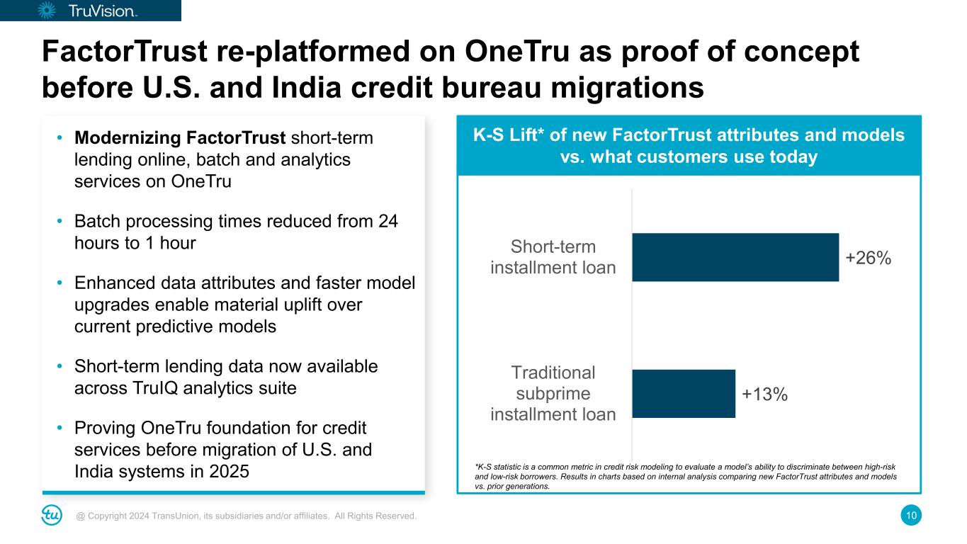 9@ Copyright 2024 TransUnion, its subsidiaries and/or affiliates. All Rights Reserved. OneTru will power next generation of growth in TruValidate fraud mitigation 46.0% 60.5% 0% 20% 40% 60% 80% 100% 31% higher fraud catch Fr au d D et ec tio n R at e What percentage of all fraud is identified? 48,094 12,024 - 10,000 20,000 30,000 40,000 50,000 60,000 Al er t Vo lu m e 75% fewer transactions being flagged as fraud How many transactions get flagged as suspicious? Consolidated onto OneTruCurrent TU Offerings • Consolidating fraud data and analytics onto OneTru materially increases fraud detection while dramatically reducing false positives • Positive feedback from beta tests with select customers​ • First general release available later this summer • Approximately $300 million fraud revenue* against a multi-billion-dollar addressable market Consolidated onto OneTru*Fraud revenue as of FY 2023 Current TU Offerings Results in charts based on internal analysis.