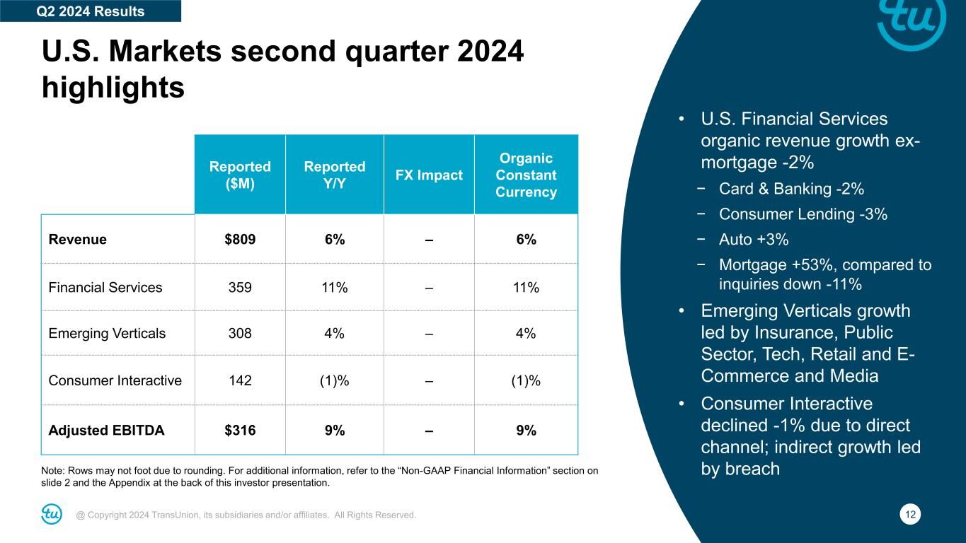 11@ Copyright 2024 TransUnion, its subsidiaries and/or affiliates. All Rights Reserved. Consolidated second quarter 2024 highlights For additional information, refer to the “Non-GAAP Financial Information” section on slide 2 and the Appendix at the back of this investor presentation. Reported ($M) Y/Y Change Revenue $1,041 8% Organic Constant Currency Revenue 8% Adjusted EBITDA $377 11% Adjusted EBITDA Margin 36.2% 115bps Adjusted Diluted EPS $0.99 15% • Organic constant currency revenue growth of +8%, or +4% excluding mortgage Q2 2024 Results