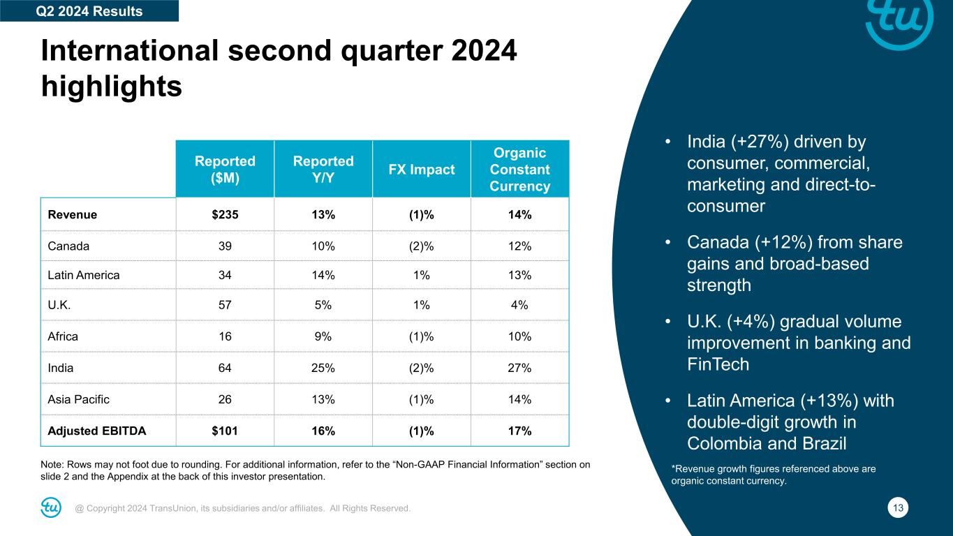 12@ Copyright 2024 TransUnion, its subsidiaries and/or affiliates. All Rights Reserved. U.S. Markets second quarter 2024 highlights Note: Rows may not foot due to rounding. For additional information, refer to the “Non-GAAP Financial Information” section on slide 2 and the Appendix at the back of this investor presentation. • U.S. Financial Services organic revenue growth ex- mortgage -2% − Card & Banking -2% − Consumer Lending -3% − Auto +3% − Mortgage +53%, compared to inquiries down -11% • Emerging Verticals growth led by Insurance, Public Sector, Tech, Retail and E- Commerce and Media • Consumer Interactive declined -1% due to direct channel; indirect growth led by breach Reported ($M) Reported Y/Y FX Impact Organic Constant Currency Revenue $809 6% – 6% Financial Services 359 11% – 11% Emerging Verticals 308 4% – 4% Consumer Interactive 142 (1)% – (1)% Adjusted EBITDA $316 9% – 9% Q2 2024 Results