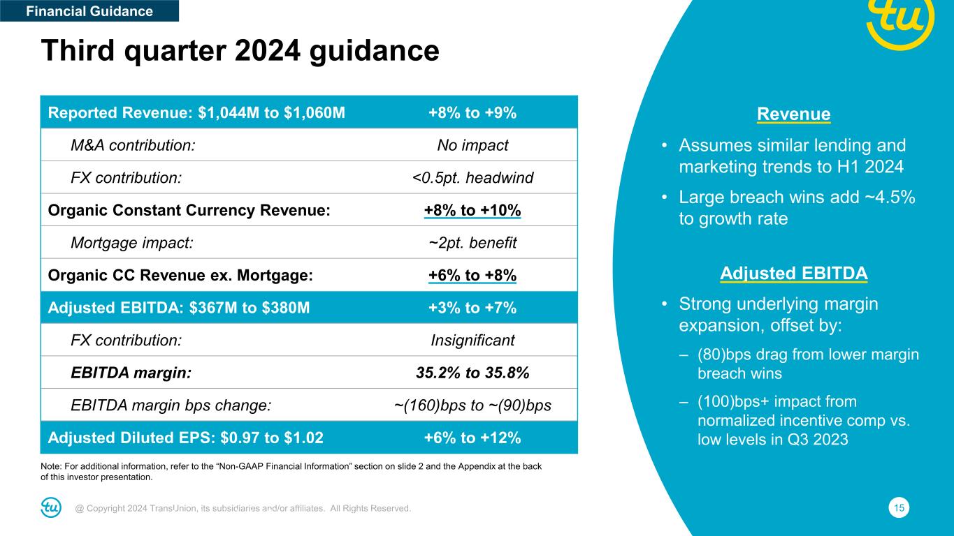 14@ Copyright 2024 TransUnion, its subsidiaries and/or affiliates. All Rights Reserved. • Roughly $5.2 billion of debt and $543 million cash at quarter-end • $80 million debt prepayment in Q2; plan to make further prepayments in 2024 • Completed refinancing of Revolving Credit Facility, Term Loan A and portion of Term Loan B-5 to extend maturity profile and reduce interest expense 1We define Leverage Ratio as net debt divided by Consolidated Adjusted EBITDA for the most recent twelve-month period including twelve months of Adjusted EBITDA from significant acquisitions. Net debt is defined as total debt less cash and cash equivalents as reported on the balance sheet as of the end of the period. Total debt is netted for deferred financing fees / original issue discount.​ Note: For additional information, refer to the “Non-GAAP Financial Information” section on slide 2 and the Appendix at the back of this investor presentation. Excess cash targeted for debt prepayment Leverage Ratio1 4.3x 3.9x 3.4x 3.1x 4.1x 3.5x 3.1x 3.5x 3.8x 3.6x 3.3x Low-3x Range <3.0x 2015 IPO 2015 2016 2017 2018 2019 2020 2021 2022 2023 Q2 2024 YE 2024 Target Q2 2024 Results