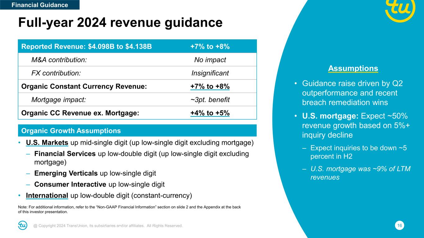 15@ Copyright 2024 TransUnion, its subsidiaries and/or affiliates. All Rights Reserved. Reported Revenue: $1,044M to $1,060M +8% to +9% M&A contribution: No impact FX contribution: <0.5pt. headwind Organic Constant Currency Revenue: +8% to +10% Mortgage impact: ~2pt. benefit Organic CC Revenue ex. Mortgage: +6% to +8% Adjusted EBITDA: $367M to $380M +3% to +7% FX contribution: Insignificant EBITDA margin: 35.2% to 35.8% EBITDA margin bps change: ~(160)bps to ~(90)bps Adjusted Diluted EPS: $0.97 to $1.02 +6% to +12% Note: For additional information, refer to the “Non-GAAP Financial Information” section on slide 2 and the Appendix at the back of this investor presentation. Revenue Third quarter 2024 guidance • Assumes similar lending and marketing trends to H1 2024 • Large breach wins add ~4.5% to growth rate Adjusted EBITDA • Strong underlying margin expansion, offset by: – (80)bps drag from lower margin breach wins – (100)bps+ impact from normalized incentive comp vs. low levels in Q3 2023 Note: For additional information, refer to the “Non-GAAP Financial Information” section on slide 2 and the Appendix at the back of this investor presentation. Financial Guidance