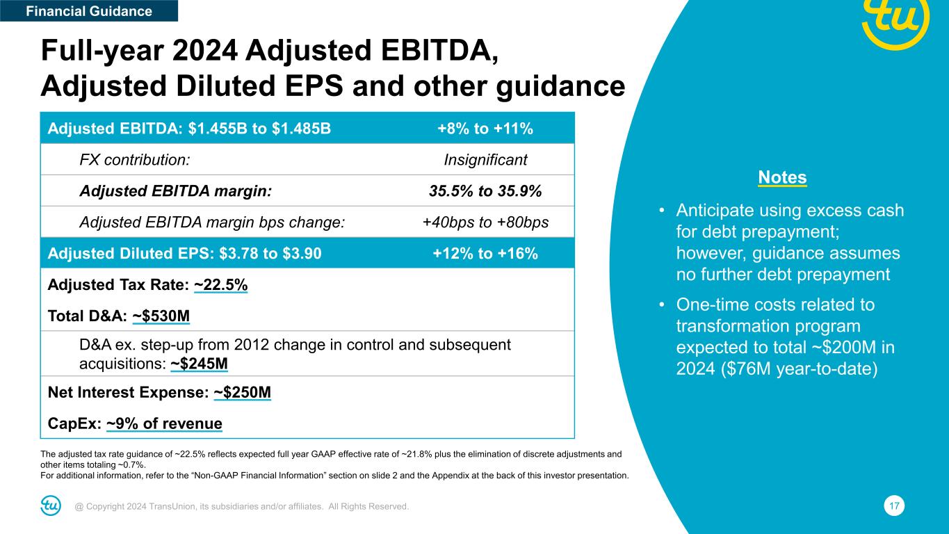 16@ Copyright 2024 TransUnion, its subsidiaries and/or affiliates. All Rights Reserved. Organic Growth Assumptions • Guidance raise driven by Q2 outperformance and recent breach remediation wins • U.S. mortgage: Expect ~50% revenue growth based on 5%+ inquiry decline – Expect inquiries to be down ~5 percent in H2 – U.S. mortgage was ~9% of LTM revenues Note: For additional information, refer to the “Non-GAAP Financial Information” section on slide 2 and the Appendix at the back of this investor presentation. Full-year 2024 revenue guidance Reported Revenue: $4.098B to $4.138B +7% to +8% M&A contribution: No impact FX contribution: Insignificant Organic Constant Currency Revenue: +7% to +8% Mortgage impact: ~3pt. benefit Organic CC Revenue ex. Mortgage: +4% to +5% Assumptions • U.S. Markets up mid-single digit (up low-single digit excluding mortgage) – Financial Services up low-double digit (up low-single digit excluding mortgage) – Emerging Verticals up low-single digit – Consumer Interactive up low-single digit • International up low-double digit (constant-currency) Note: For additional information, refer to the “Non-GAAP Financial Information” section on slide 2 and the Appendix at the back of this investor presentation. Financial Guidance