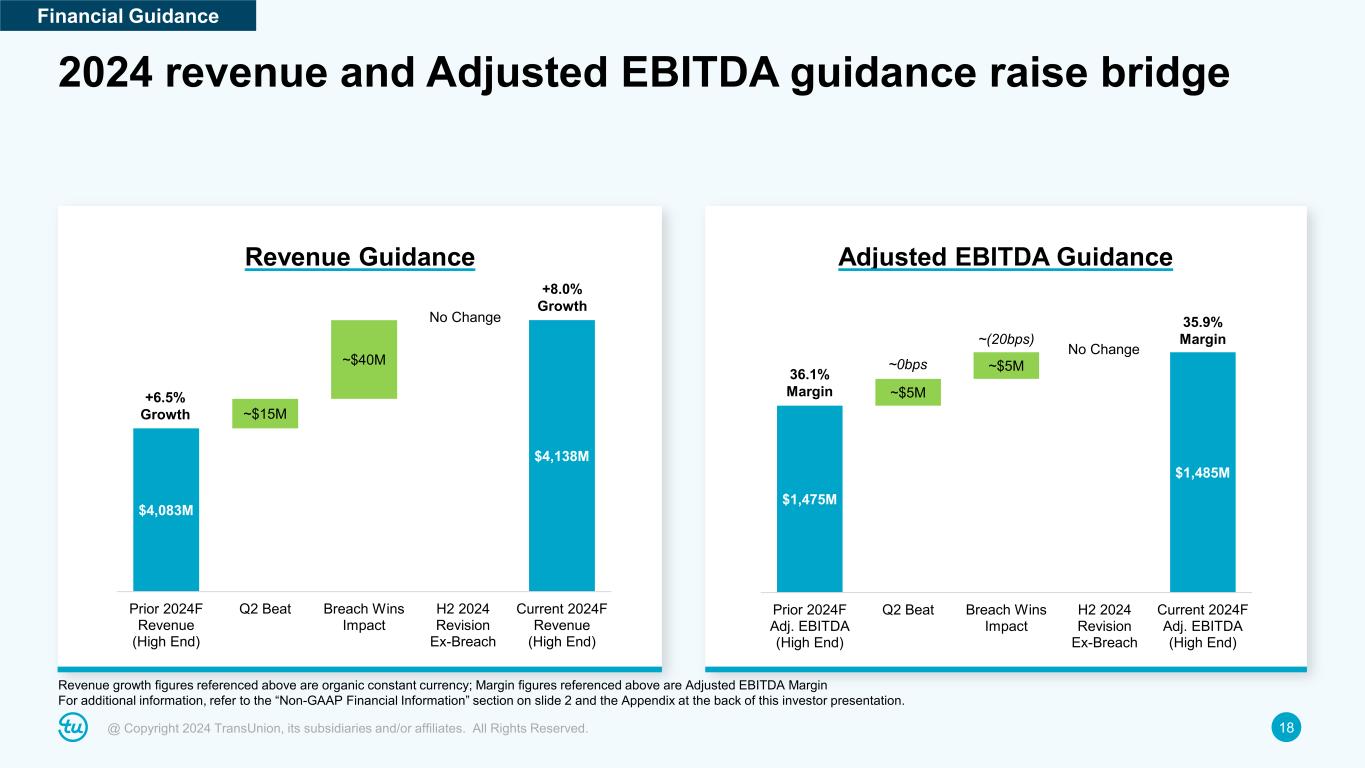 17@ Copyright 2024 TransUnion, its subsidiaries and/or affiliates. All Rights Reserved. The adjusted tax rate guidance of ~22.5% reflects expected full year GAAP effective rate of ~21.8% plus the elimination of discrete adjustments and other items totaling ~0.7%. For additional information, refer to the “Non-GAAP Financial Information” section on slide 2 and the Appendix at the back of this investor presentation. Full-year 2024 Adjusted EBITDA, Adjusted Diluted EPS and other guidance Adjusted EBITDA: $1.455B to $1.485B +8% to +11% FX contribution: Insignificant Adjusted EBITDA margin: 35.5% to 35.9% Adjusted EBITDA margin bps change: +40bps to +80bps Adjusted Diluted EPS: $3.78 to $3.90 +12% to +16% Adjusted Tax Rate: ~22.5% Total D&A: ~$530M D&A ex. step-up from 2012 change in control and subsequent acquisitions: ~$245M Net Interest Expense: ~$250M CapEx: ~9% of revenue • Anticipate using excess cash for debt prepayment; however, guidance assumes no further debt prepayment • One-time costs related to transformation program expected to total ~$200M in 2024 ($76M year-to-date) Notes Financial Guidance