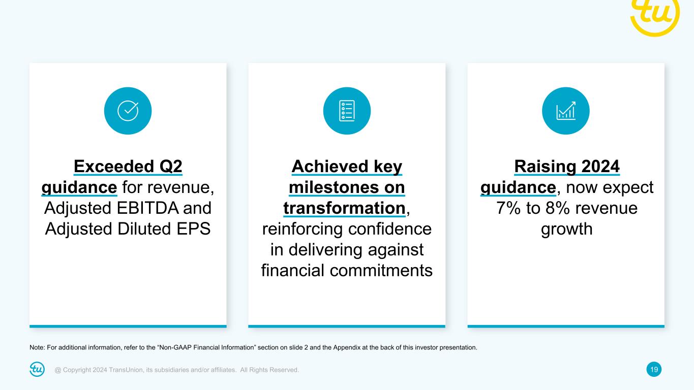 18@ Copyright 2024 TransUnion, its subsidiaries and/or affiliates. All Rights Reserved. $1,475M $1,485M ~$5M ~$5M No Change Prior 2024F Adj. EBITDA (High End) Q2 Beat Breach Wins Impact H2 2024 Revision Ex-Breach Current 2024F Adj. EBITDA (High End) $4,083M $4,138M ~$15M ~$40M No Change Prior 2024F Revenue (High End) Q2 Beat Breach Wins Impact H2 2024 Revision Ex-Breach Current 2024F Revenue (High End) 2024 revenue and Adjusted EBITDA guidance raise bridge Revenue Guidance Adjusted EBITDA Guidance Revenue growth figures referenced above are organic constant currency; Margin figures referenced above are Adjusted EBITDA Margin For additional information, refer to the “Non-GAAP Financial Information” section on slide 2 and the Appendix at the back of this investor presentation. ~0bps ~(20bps) 35.9% Margin 36.1% Margin +8.0% Growth +6.5% Growth Financial Guidance