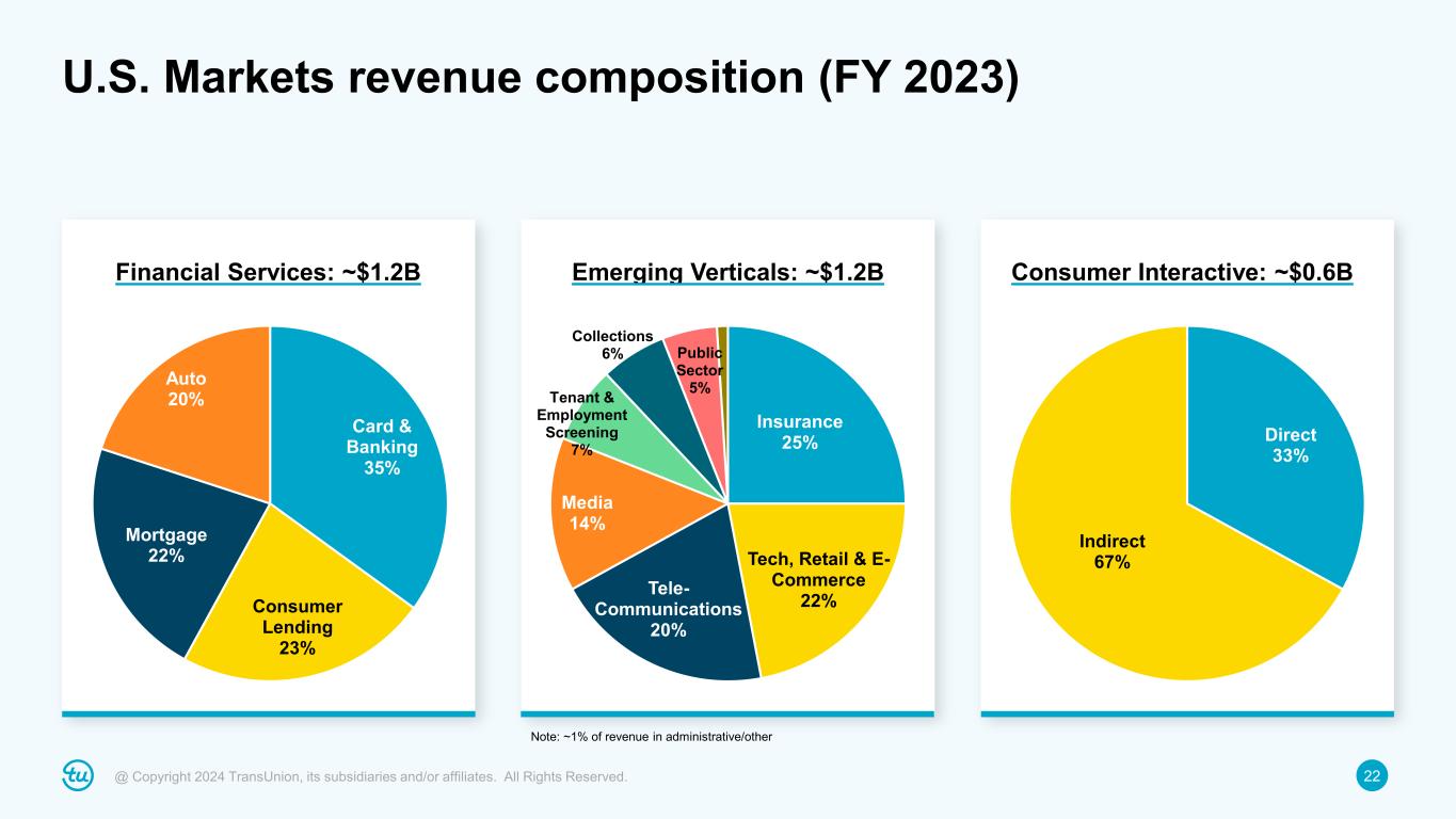 22@ Copyright 2024 TransUnion, its subsidiaries and/or affiliates. All Rights Reserved. U.S. Markets revenue composition (FY 2023) Financial Services: ~$1.2B Emerging Verticals: ~$1.2B Consumer Interactive: ~$0.6B Card & Banking 35% Consumer Lending 23% Mortgage 22% Auto 20% Insurance 25% Tech, Retail & E- Commerce 22%Tele- Communications 20% Media 14% Tenant & Employment Screening 7% Collections 6% Public Sector 5% Direct 33% Indirect 67% Note: ~1% of revenue in administrative/other