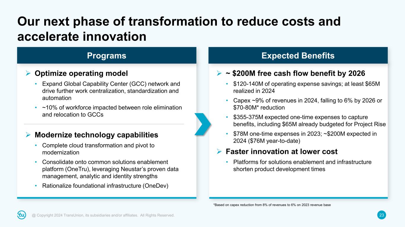 23@ Copyright 2024 TransUnion, its subsidiaries and/or affiliates. All Rights Reserved. Our next phase of transformation to reduce costs and accelerate innovation  Optimize operating model • Expand Global Capability Center (GCC) network and drive further work centralization, standardization and automation • ~10% of workforce impacted between role elimination and relocation to GCCs  Modernize technology capabilities • Complete cloud transformation and pivot to modernization • Consolidate onto common solutions enablement platform (OneTru), leveraging Neustar’s proven data management, analytic and identity strengths • Rationalize foundational infrastructure (OneDev)  ~ $200M free cash flow benefit by 2026 • $120-140M of operating expense savings; at least $65M realized in 2024 • Capex ~9% of revenues in 2024, falling to 6% by 2026 or $70-80M* reduction • $355-375M expected one-time expenses to capture benefits, including $65M already budgeted for Project Rise • $78M one-time expenses in 2023; ~$200M expected in 2024 ($76M year-to-date)  Faster innovation at lower cost • Platforms for solutions enablement and infrastructure shorten product development times *Based on capex reduction from 8% of revenues to 6% on 2023 revenue base Programs Expected Benefits