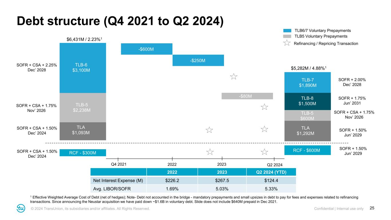 @ Copyright 2024 TransUnion, its subsidiaries and/or affiliates. All Rights Reserved. 24 Debt profile and 2024F interest expense bridge Debt Profile (06/30/24) 2024F Interest Expense Bridge Notional ($B) Expiry Rate Term Loan Tranche Term Loan A-4 1.3 Jun’29 SOFR + 1.50% Term Loan B-5 0.6 Nov’26 SOFR + CSA + 1.75% Term Loan B-7 1.9 Dec’28 SOFR + 2.00% Term Loan B-8 1.5 Jun’31 SOFR + 1.75% Swaps* June 2020 1.1 Jun’25 Receive SOFR, Pay 0.87% December 2021 1.6 Dec’26 Receive SOFR, Pay 1.39% December 2022 1.3 Dec’24 Receive SOFR, Pay 4.36% • ~74% of debt is currently swapped to fixed rate • 2024 net interest expense guidance assumes no additional debt prepayment or incremental debt $267M ~$250M ~($12M) ~($9M) ~$4M 2023 Net Interest Expense 2023 / 2024 Prepayments Refinancings SOFR/ Other 2024F Net Interest Expense