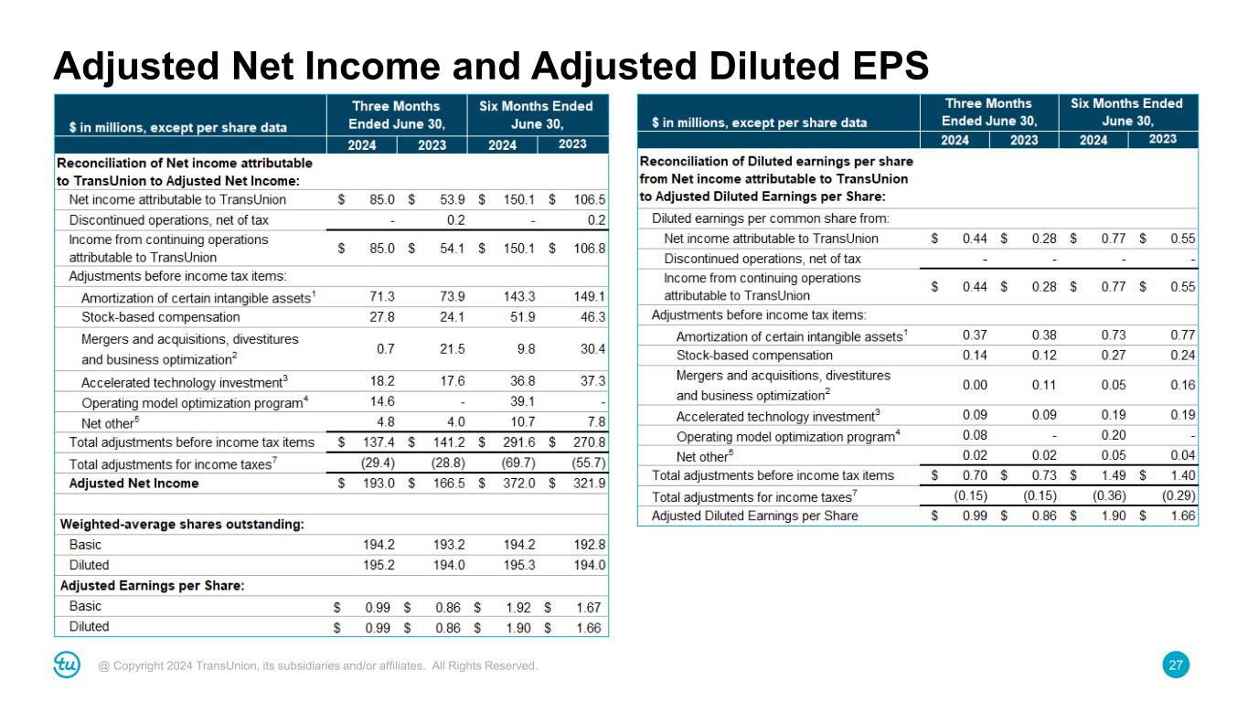 27@ Copyright 2024 TransUnion, its subsidiaries and/or affiliates. All Rights Reserved. Adjusted Net Income and Adjusted Diluted EPS