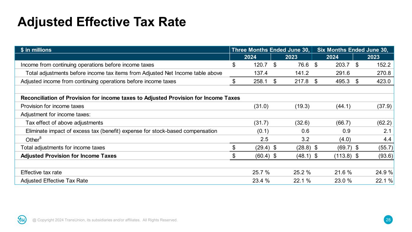 28@ Copyright 2024 TransUnion, its subsidiaries and/or affiliates. All Rights Reserved. Adjusted Effective Tax Rate $ in millions 2024 2023 2024 2023 Income from continuing operations before income taxes $ 120.7 $ 76.6 $ 203.7 $ 152.2 Total adjustments before income tax items from Adjusted Net Income table above 137.4 141.2 291.6 270.8 Adjusted income from continuing operations before income taxes $ 258.1 $ 217.8 $ 495.3 $ 423.0 Reconciliation of Provision for income taxes to Adjusted Provision for Income Taxes Provision for income taxes (31.0) (19.3) (44.1) (37.9) Adjustment for income taxes: Tax effect of above adjustments (31.7) (32.6) (66.7) (62.2) Eliminate impact of excess tax (benefit) expense for stock-based compensation (0.1) 0.6 0.9 2.1 Other8 2.5 3.2 (4.0) 4.4 Total adjustments for income taxes $ (29.4) $ (28.8) $ (69.7) $ (55.7) Adjusted Provision for Income Taxes $ (60.4) $ (48.1) $ (113.8) $ (93.6) Effective tax rate 25.7 % 25.2 % 21.6 % 24.9 % Adjusted Effective Tax Rate 23.4 % 22.1 % 23.0 % 22.1 % Three Months Ended June 30, Six Months Ended June 30,