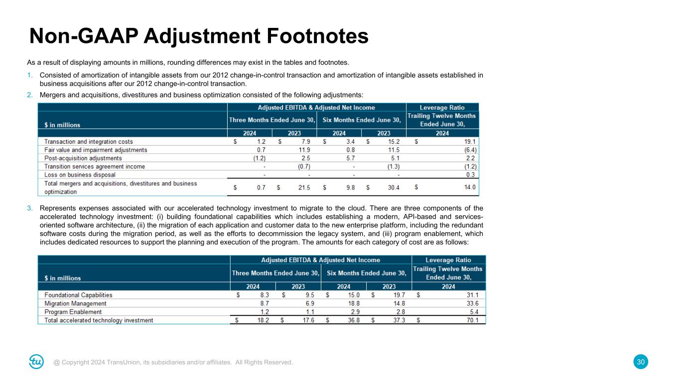30@ Copyright 2024 TransUnion, its subsidiaries and/or affiliates. All Rights Reserved. Non-GAAP Adjustment Footnotes As a result of displaying amounts in millions, rounding differences may exist in the tables and footnotes. 1. Consisted of amortization of intangible assets from our 2012 change-in-control transaction and amortization of intangible assets established in business acquisitions after our 2012 change-in-control transaction. 2. Mergers and acquisitions, divestitures and business optimization consisted of the following adjustments: 3. Represents expenses associated with our accelerated technology investment to migrate to the cloud. There are three components of the accelerated technology investment: (i) building foundational capabilities which includes establishing a modern, API-based and services- oriented software architecture, (ii) the migration of each application and customer data to the new enterprise platform, including the redundant software costs during the migration period, as well as the efforts to decommission the legacy system, and (iii) program enablement, which includes dedicated resources to support the planning and execution of the program. The amounts for each category of cost are as follows: