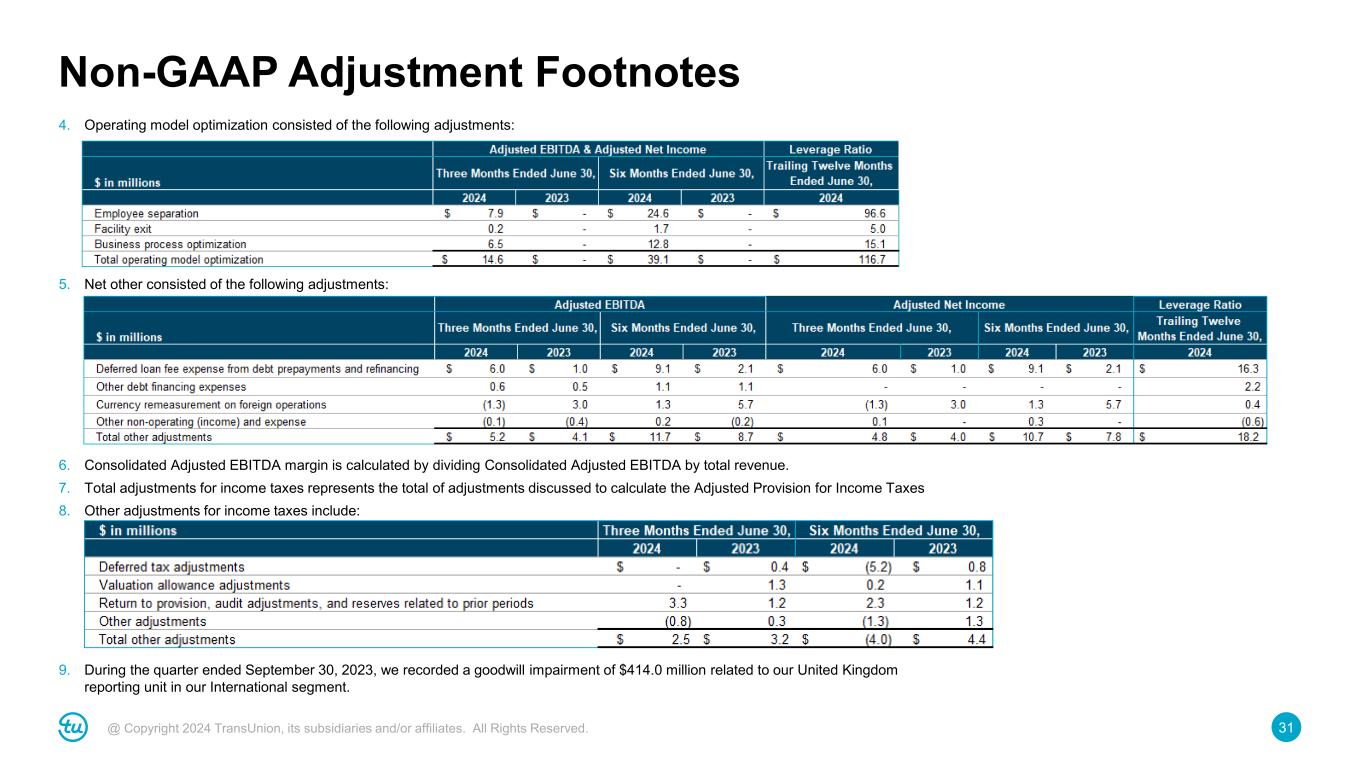 31@ Copyright 2024 TransUnion, its subsidiaries and/or affiliates. All Rights Reserved. Non-GAAP Adjustment Footnotes 4. Operating model optimization consisted of the following adjustments: 5. Net other consisted of the following adjustments: 6. Consolidated Adjusted EBITDA margin is calculated by dividing Consolidated Adjusted EBITDA by total revenue. 7. Total adjustments for income taxes represents the total of adjustments discussed to calculate the Adjusted Provision for Income Taxes 8. Other adjustments for income taxes include: 9. During the quarter ended September 30, 2023, we recorded a goodwill impairment of $414.0 million related to our United Kingdom reporting unit in our International segment.