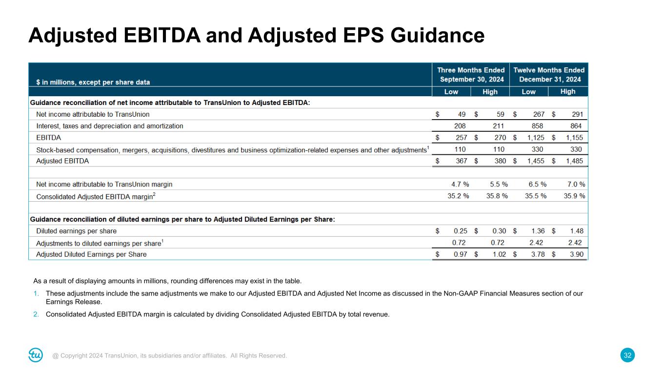 32@ Copyright 2024 TransUnion, its subsidiaries and/or affiliates. All Rights Reserved. Adjusted EBITDA and Adjusted EPS Guidance As a result of displaying amounts in millions, rounding differences may exist in the table. 1. These adjustments include the same adjustments we make to our Adjusted EBITDA and Adjusted Net Income as discussed in the Non-GAAP Financial Measures section of our Earnings Release. 2. Consolidated Adjusted EBITDA margin is calculated by dividing Consolidated Adjusted EBITDA by total revenue.