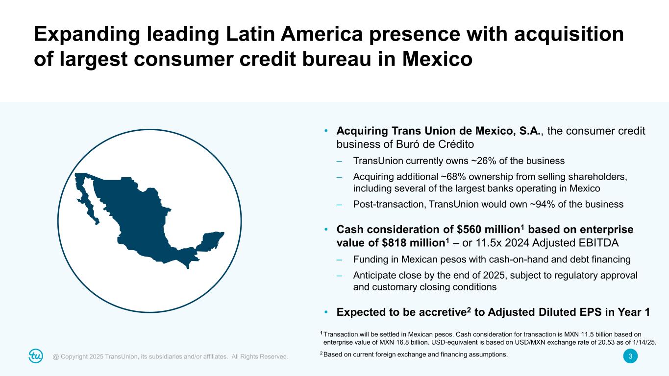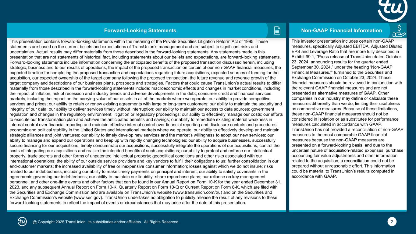 2@ Copyright 2025 TransUnion, its subsidiaries and/or affiliates. All Rights Reserved. Non-GAAP Financial InformationForward-Looking Statements This presentation contains forward-looking statements within the meaning of the Private Securities Litigation Reform Act of 1995. These statements are based on the current beliefs and expectations of TransUnion’s management and are subject to significant risks and uncertainties. Actual results may differ materially from those described in the forward-looking statements. Any statements made in this presentation that are not statements of historical fact, including statements about our beliefs and expectations, are forward-looking statements. Forward-looking statements include information concerning the anticipated benefits of the proposed transaction discussed herein, including strategic, business and to our results of operations, the impact of the proposed transaction on certain of our non-GAAP financial measures, the expected timeline for completing the proposed transaction and expectations regarding future acquisitions, expected sources of funding for the acquisition, our expected ownership of the target company following the proposed transaction, the future revenue and revenue growth of the target company and descriptions of our business plans, prospects and strategies. Factors that could cause TransUnion’s actual results to differ materially from those described in the forward-looking statements include: macroeconomic effects and changes in market conditions, including the impact of inflation, risk of recession and industry trends and adverse developments in the debt, consumer credit and financial services markets, including the impact on the carrying value of our assets in all of the markets where we operate; our ability to provide competitive services and prices; our ability to retain or renew existing agreements with large or long-term customers; our ability to maintain the security and integrity of our data; our ability to deliver services timely without interruption; our ability to maintain our access to data sources; government regulation and changes in the regulatory environment; litigation or regulatory proceedings; our ability to effectively manage our costs; our efforts to execute our transformation plan and achieve the anticipated benefits and savings; our ability to remediate existing material weakness in internal control over financial reporting and maintain effective internal control over financial reporting and disclosure controls and procedures; economic and political stability in the United States and international markets where we operate; our ability to effectively develop and maintain strategic alliances and joint ventures; our ability to timely develop new services and the market’s willingness to adopt our new services; our ability to manage and expand our operations and keep up with rapidly changing technologies; our ability to acquire businesses, successfully secure financing for our acquisitions, timely consummate our acquisitions, successfully integrate the operations of our acquisitions, control the costs of integrating our acquisitions and realize the intended benefits of such acquisitions; our ability to protect and enforce our intellectual property, trade secrets and other forms of unpatented intellectual property; geopolitical conditions and other risks associated with our international operations; the ability of our outside service providers and key vendors to fulfill their obligations to us; further consolidation in our end-customer markets; the increased availability of free or inexpensive consumer information; losses against which we do not insure; risks related to our indebtedness, including our ability to make timely payments on principal and interest; our ability to satisfy covenants in the agreements governing our indebtedness; our ability to maintain our liquidity; share repurchase plans; our reliance on key management personnel; and other one-time events and other factors that can be found in our Annual Report on Form 10-K for the year ended December 31, 2023, and any subsequent Annual Report on Form 10-K, Quarterly Report on Form 10-Q or Current Report on Form 8-K, which are filed with the Securities and Exchange Commission and are available on TransUnion’s website (www.transunion.com/tru) and on the Securities and Exchange Commission’s website (www.sec.gov). TransUnion undertakes no obligation to publicly release the result of any revisions to these forward-looking statements to reflect the impact of events or circumstances that may arise after the date of this presentation. This investor presentation includes certain non-GAAP measures, specifically Adjusted EBITDA, Adjusted Diluted EPS and Leverage Ratio that are more fully described in Exhibit 99.1, “Press release of TransUnion dated October 23, 2024, announcing results for the quarter ended September 30, 2024,” under the heading ‘Non-GAAP Financial Measures,’” furnished to the Securities and Exchange Commission on October 23, 2024. These financial measures should be reviewed in conjunction with the relevant GAAP financial measures and are not presented as alternative measures of GAAP. Other companies in our industry may define or calculate these measures differently than we do, limiting their usefulness as comparative measures. Because of these limitations, these non-GAAP financial measures should not be considered in isolation or as substitutes for performance measures calculated in accordance with GAAP. TransUnion has not provided a reconciliation of non-GAAP measures to the most comparable GAAP financial measures because the non-GAAP measures are presented on a forward-looking basis, and due to the uncertain nature of acquisition-related expenses, purchase accounting fair value adjustments and other information related to the acquisition, a reconciliation could not be prepared without unreasonable effort. This information cou