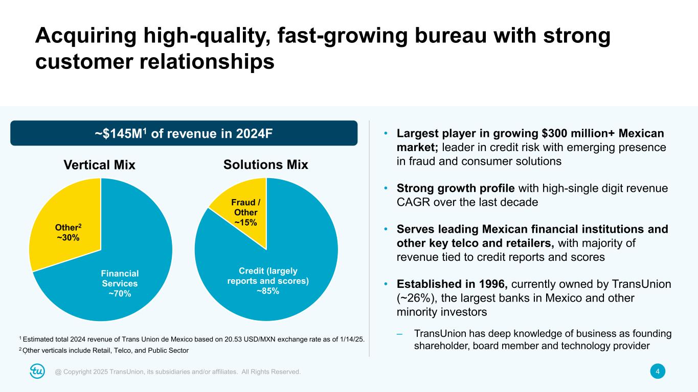 3@ Copyright 2025 TransUnion, its subsidiaries and/or affiliates. All Rights Reserved. • Acquiring Trans Union de Mexico, S.A., the consumer credit business of Buró de Crédito – TransUnion currently owns ~26% of the business – Acquiring additional ~68% ownership from selling shareholders, including several of the largest banks operating in Mexico – Post-transaction, TransUnion would own ~94% of the business • Cash consideration of $560 million1 based on enterprise value of $818 million1 – or 11.5x 2024 Adjusted EBITDA – Funding in Mexican pesos with cash-on-hand and debt financing – Anticipate close by the end of 2025, subject to regulatory approval and customary closing conditions • Expected to be accretive2 to Adjusted Diluted EPS in Year 1 Expanding leading Latin America presence with acquisition of largest consumer credit bureau in Mexico 1 Transaction will be settled in Mexican pesos. Cash consideration for transaction is MXN 11.5 billion based on enterprise value of MXN 16.8 billion. USD-equivalent is based on USD/MXN exchange rate of 20.53 as of 1/14/25. 2 Based on current foreign exchange and financing assumptions.