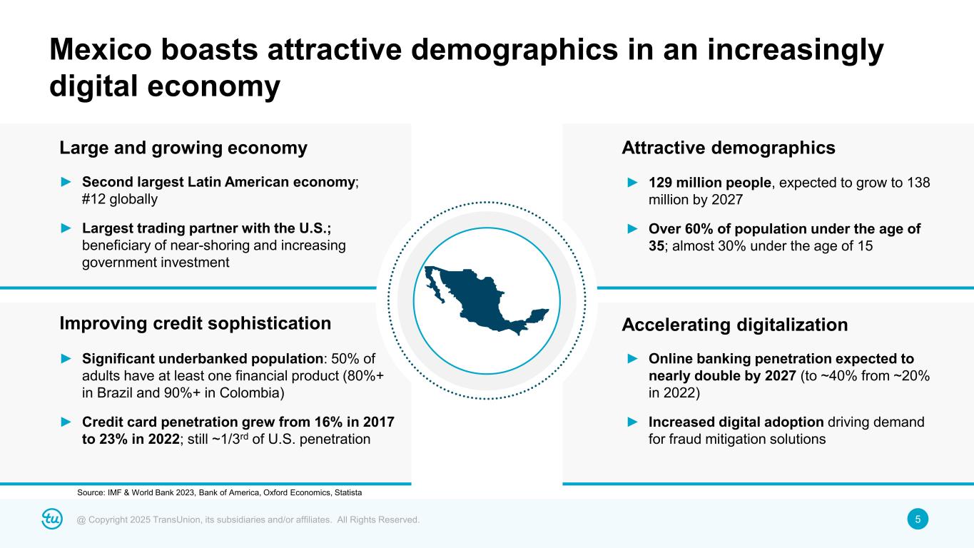 4@ Copyright 2025 TransUnion, its subsidiaries and/or affiliates. All Rights Reserved. • Largest player in growing $300 million+ Mexican market; leader in credit risk with emerging presence in fraud and consumer solutions • Strong growth profile with high-single digit revenue CAGR over the last decade • Serves leading Mexican financial institutions and other key telco and retailers, with majority of revenue tied to credit reports and scores • Established in 1996, currently owned by TransUnion (~26%), the largest banks in Mexico and other minority investors – TransUnion has deep knowledge of business as founding shareholder, board member and technology provider Acquiring high-quality, fast-growing bureau with strong customer relationships ~$145M1 of revenue in 2024F . Financial Services ~70% Other2 ~30% Vertical Mix Credit (largely reports and scores) ~85% Fraud / Other ~15% Solutions Mix 1 Estimated total 2024 revenue of Trans Union de Mexico based on 20.53 USD/MXN exchange rate as of 1/14/25. 2 Other verticals include Retail, Telco, and Public Sector