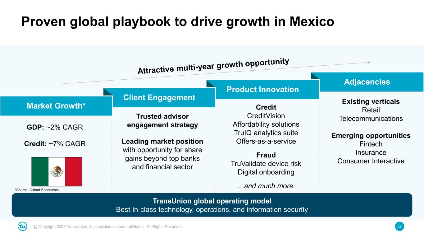 5@ Copyright 2025 TransUnion, its subsidiaries and/or affiliates. All Rights Reserved. Mexico boasts attractive demographics in an increasingly digital economy Attractive demographics ► 129 million people, expected to grow to 138 million by 2027 ► Over 60% of population under the age of 35; almost 30% under the age of 15 ► Online banking penetration expected to nearly double by 2027 (to ~40% from ~20% in 2022) ► Increased digital adoption driving demand for fraud mitigation solutions Accelerating digitalizationImproving credit sophistication ► Significant underbanked population: 50% of adults have at least one financial product (80%+ in Brazil and 90%+ in Colombia) ► Credit card penetration grew from 16% in 2017 to 23% in 2022; still ~1/3rd of U.S. penetration ► Second largest Latin American economy; #12 globally ► Largest trading partner with the U.S.; beneficiary of near-shoring and increasing government investment Large and growing economy Source: IMF & World Bank 2023, Bank of America, Oxford Economics, Statista