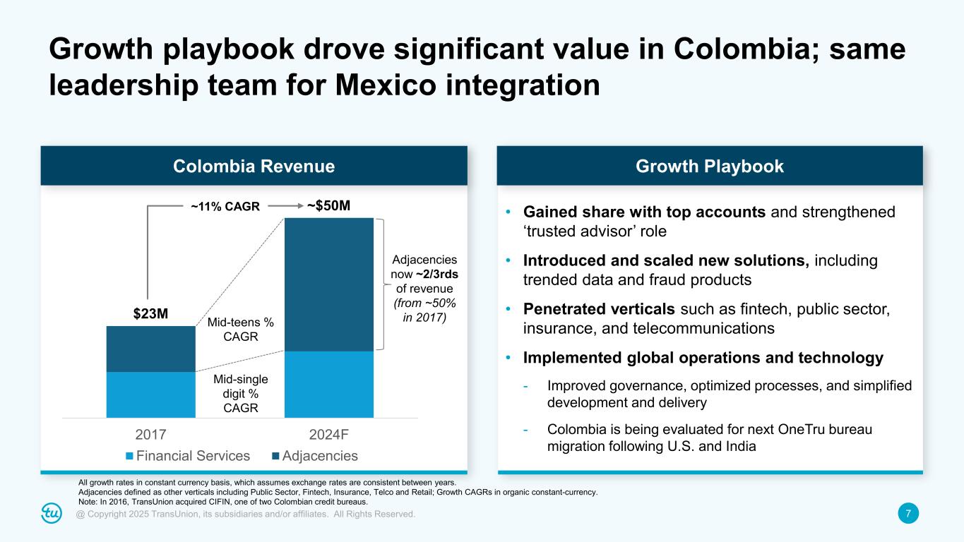 6@ Copyright 2025 TransUnion, its subsidiaries and/or affiliates. All Rights Reserved. Existing verticals Retail Telecommunications Emerging opportunities Fintech Insurance Consumer Interactive Credit CreditVision Affordability solutions TruIQ analytics suite Offers-as-a-service Fraud TruValidate device risk Digital onboarding …and much more. Trusted advisor engagement strategy Leading market position with opportunity for share gains beyond top banks and financial sector GDP: ~2% CAGR Credit: ~7% CAGR Adjacencies Product Innovation Client Engagement Market Growth* Proven global playbook to drive growth in Mexico TransUnion global operating model Best-in-class technology, operations, and information security *Source: Oxford Economics