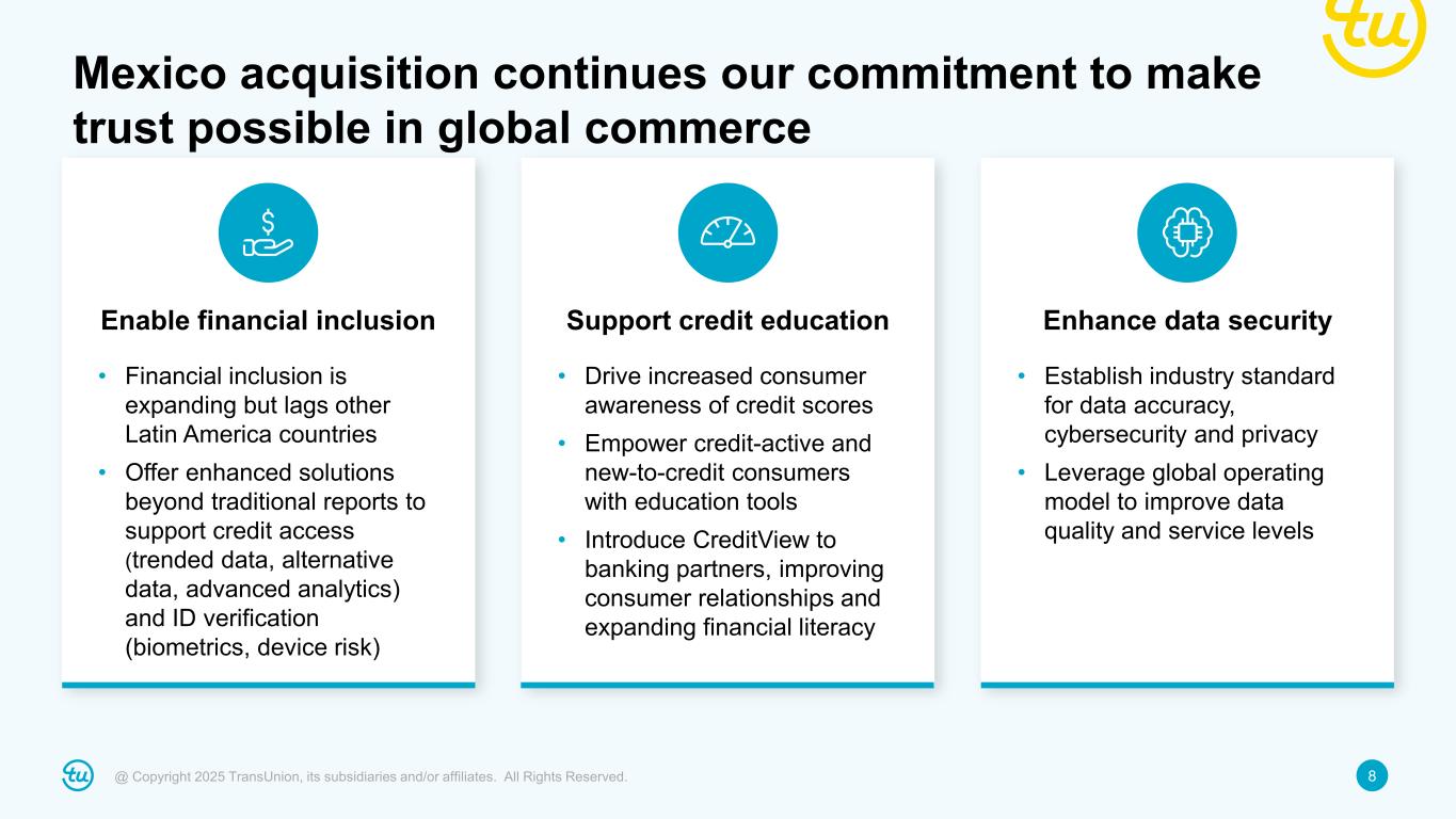 7@ Copyright 2025 TransUnion, its subsidiaries and/or affiliates. All Rights Reserved. $23M ~$50M 2017 2024F Financial Services Adjacencies • Gained share with top accounts and strengthened ‘trusted advisor’ role • Introduced and scaled new solutions, including trended data and fraud products • Penetrated verticals such as fintech, public sector, insurance, and telecommunications • Implemented global operations and technology - Improved governance, optimized processes, and simplified development and delivery - Colombia is being evaluated for next OneTru bureau migration following U.S. and India Growth playbook drove significant value in Colombia; same leadership team for Mexico integration Colombia Revenue Growth Playbook All growth rates in constant currency basis, which assumes exchange rates are consistent between years. Adjacencies defined as other verticals including Public Sector, Fintech, Insurance, Telco and Retail; Growth CAGRs in organic constant-currency. Note: In 2016, TransUnion acquired CIFIN, one of two Colombian credit bureaus. Adjacencies now ~2/3rds of revenue (from ~50% in 2017)Mid-teens % CAGR Mid-single digit % CAGR ~11% CAGR
