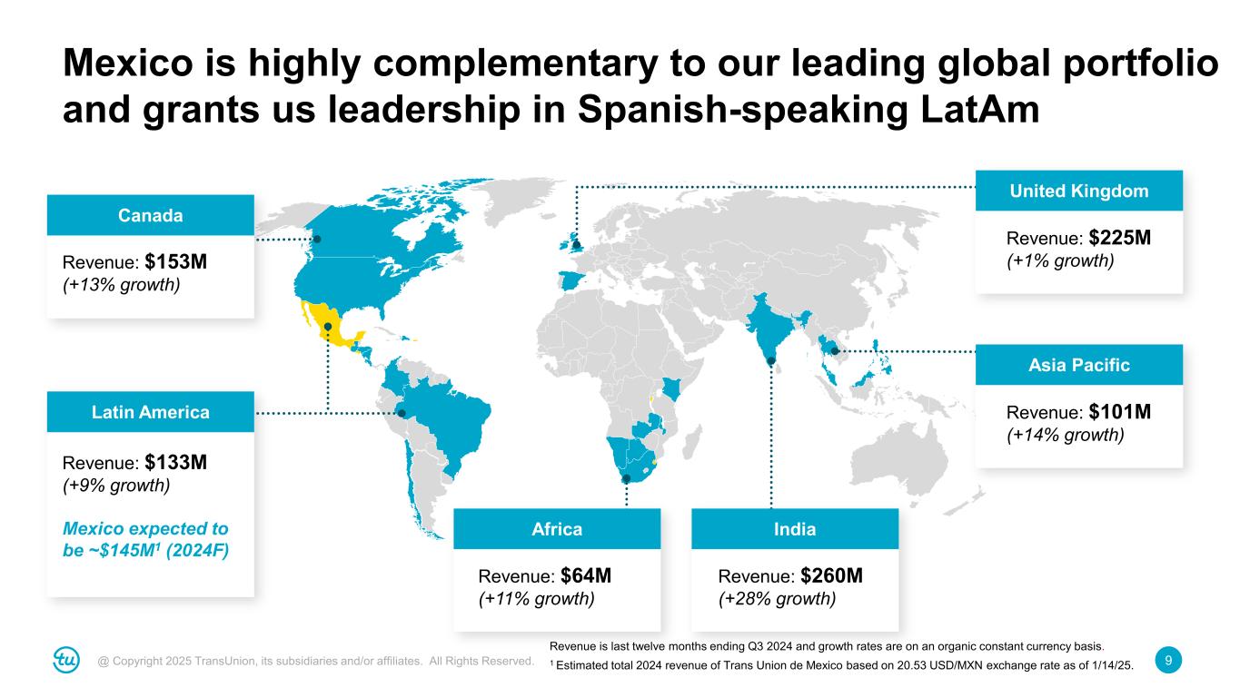 8@ Copyright 2025 TransUnion, its subsidiaries and/or affiliates. All Rights Reserved. • Financial inclusion is expanding but lags other Latin America countries • Offer enhanced solutions beyond traditional reports to support credit access (trended data, alternative data, advanced analytics) and ID verification (biometrics, device risk) • Drive increased consumer awareness of credit scores • Empower credit-active and new-to-credit consumers with education tools • Introduce CreditView to banking partners, improving consumer relationships and expanding financial literacy • Establish industry standard for data accuracy, cybersecurity and privacy • Leverage global operating model to improve data quality and service levels Enable financial inclusion Support credit education Mexico acquisition continues our commitment to make trust possible in global commerce Enhance data security