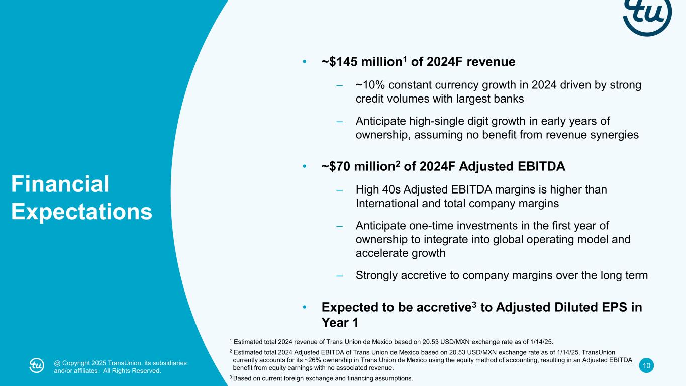 9@ Copyright 2025 TransUnion, its subsidiaries and/or affiliates. All Rights Reserved. Revenue: $153M (+13% growth) Revenue: $133M (+9% growth) Mexico expected to be ~$145M1 (2024F) Canada Latin America Mexico is highly complementary to our leading global portfolio and grants us leadership in Spanish-speaking LatAm Revenue is last twelve months ending Q3 2024 and growth rates are on an organic constant currency basis. 1 Estimated total 2024 revenue of Trans Union de Mexico based on 20.53 USD/MXN exchange rate as of 1/14/25. Asia Pacific IndiaAfrica Revenue: $64M (+11% growth) Revenue: $260M (+28% growth) Revenue: $101M (+14% growth) United Kingdom Revenue: $225M (+1% growth)