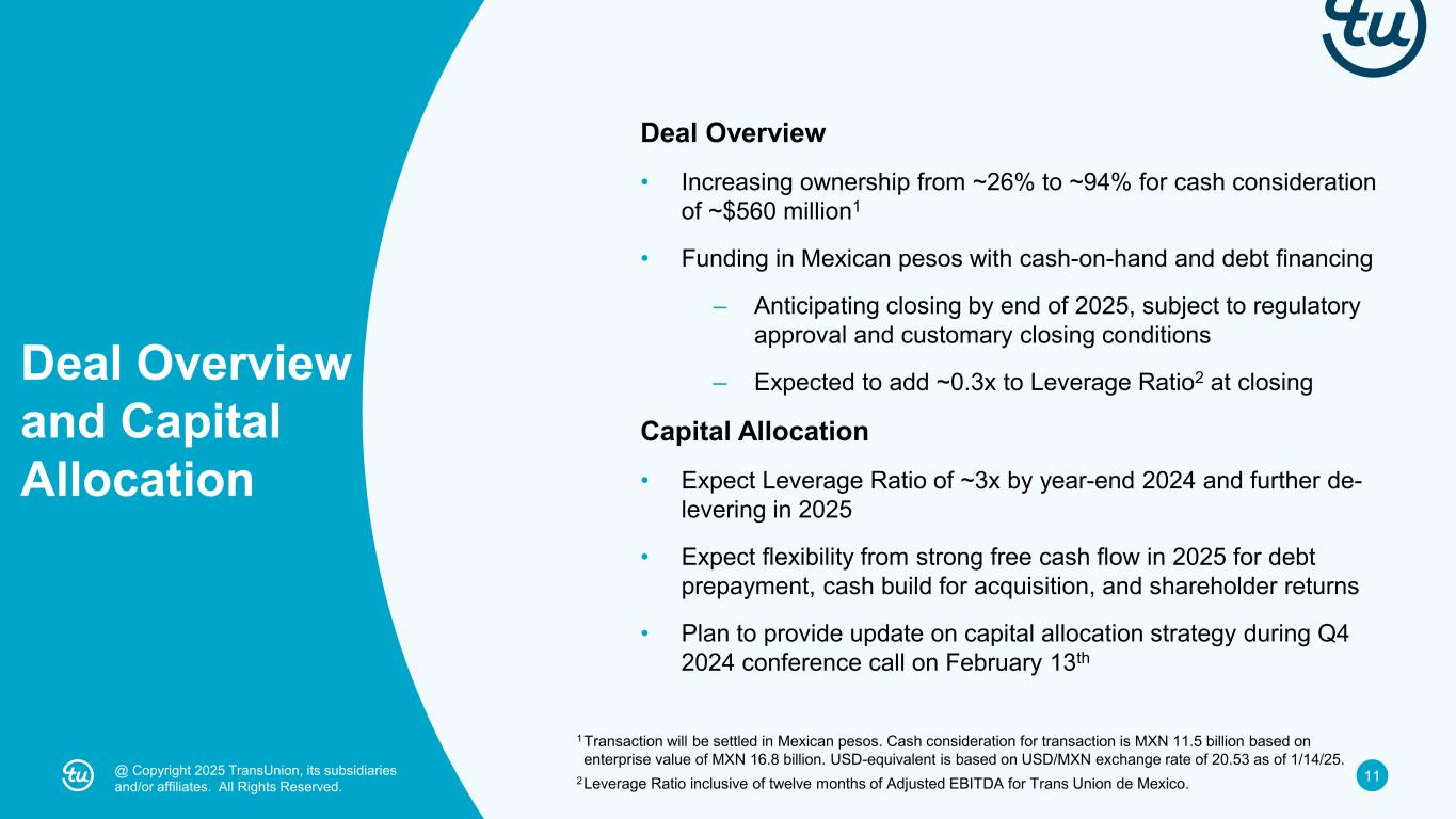 10@ Copyright 2025 TransUnion, its subsidiaries and/or affiliates. All Rights Reserved.@ Copyright 2025 TransUnion, its subsidiaries and/or affiliates. All Rights Reserved. Financial Expectations • ~$145 million1 of 2024F revenue – ~10% constant currency growth in 2024 driven by strong credit volumes with largest banks – Anticipate high-single digit growth in early years of ownership, assuming no benefit from revenue synergies • ~$70 million2 of 2024F Adjusted EBITDA – High 40s Adjusted EBITDA margins is higher than International and total company margins – Anticipate one-time investments in the first year of ownership to integrate into global operating model and accelerate growth – Strongly accretive to company margins over the long term • Expected to be accretive3 to Adjusted Diluted EPS in Year 1 1 Estimated total 2024 revenue of Trans Union de Mexico based on 20.53 USD/MXN exchange rate as of 1/14/25. 2 Estimated total 2024 Adjusted EBITDA of Trans Union de Mexico based on 20.53 USD/MXN exchange rate as of 1/14/25. TransUnion currently accounts for its ~26% ownership in Trans Union de Mexico using the equity method of accounting, resulting in an Adjusted EBITDA benefit from equity earnings with no associated revenue. 3 Based on current foreign exchange and financing assumptions.