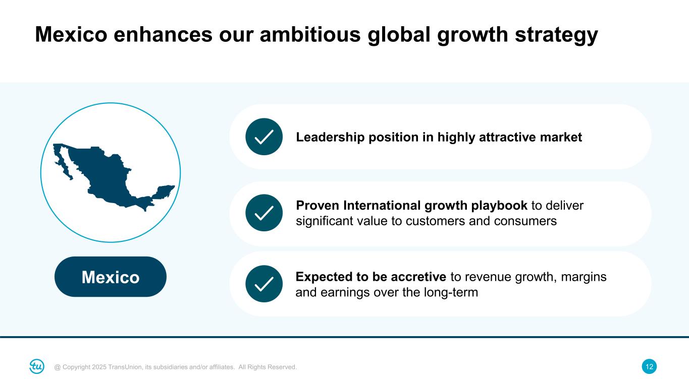 12@ Copyright 2025 TransUnion, its subsidiaries and/or affiliates. All Rights Reserved. Mexico enhances our ambitious global growth strategy Mexico Leadership position in highly attractive market Proven International growth playbook to deliver significant value to customers and consumers Expected to be accretive to revenue growth, margins and earnings over the long-term