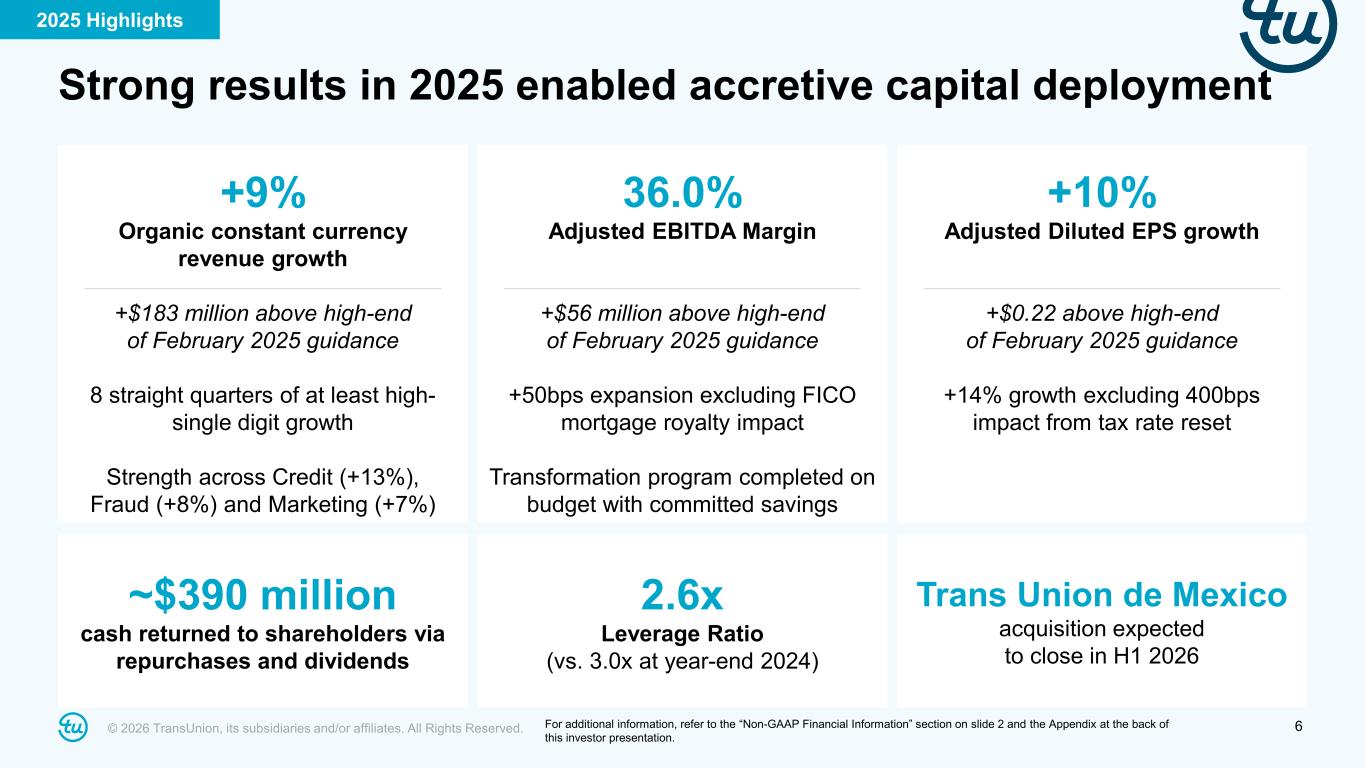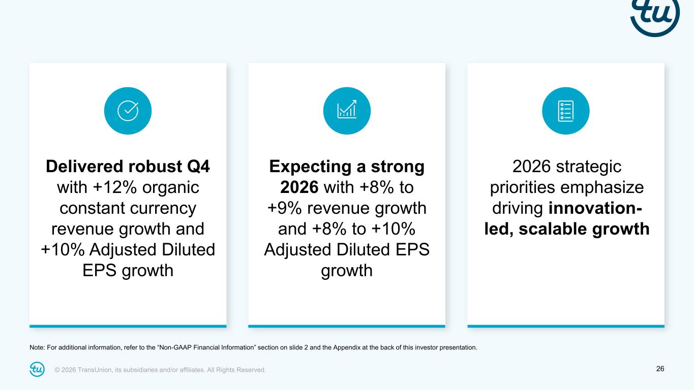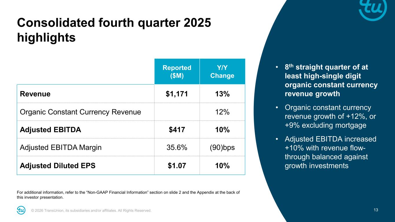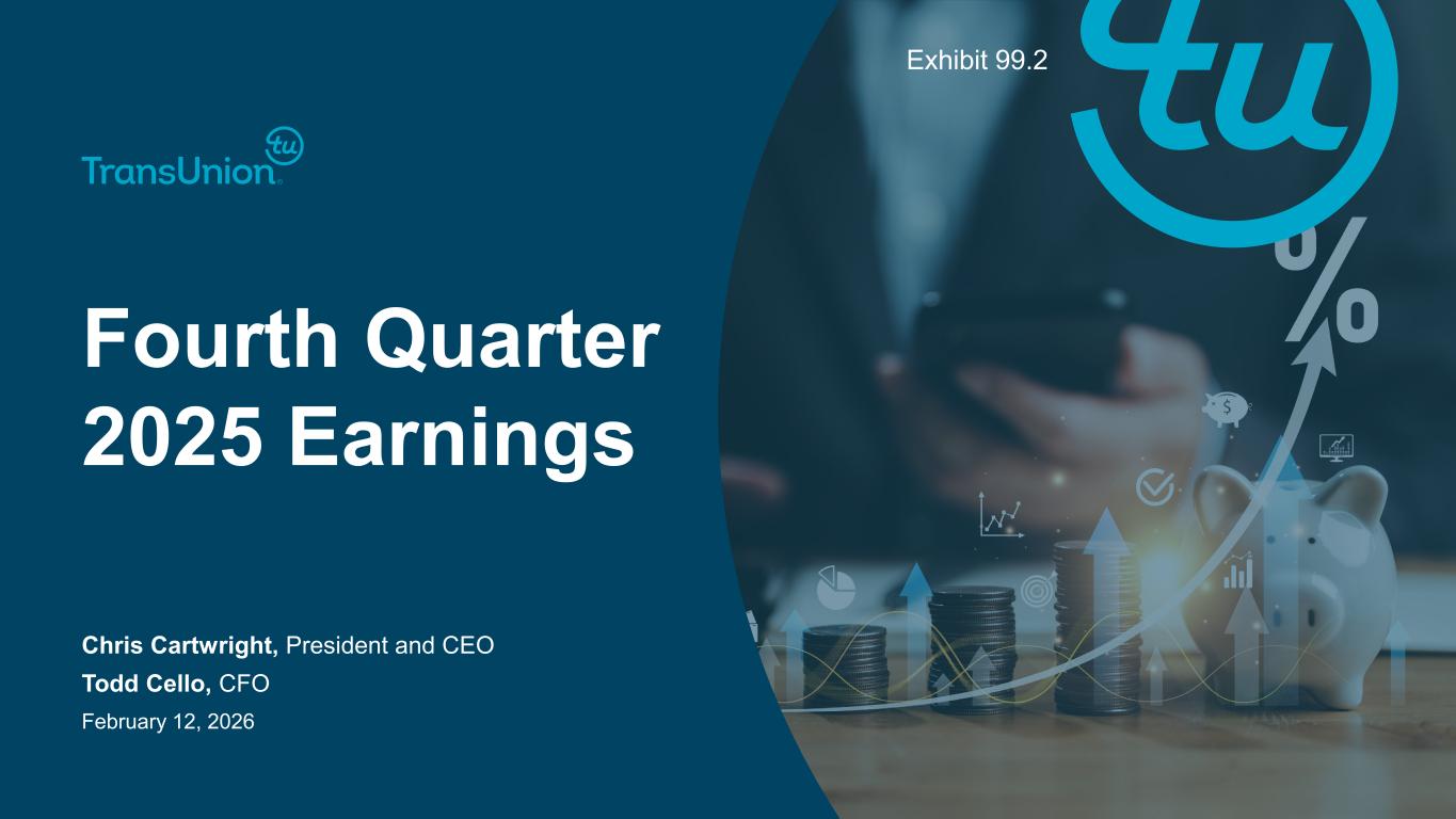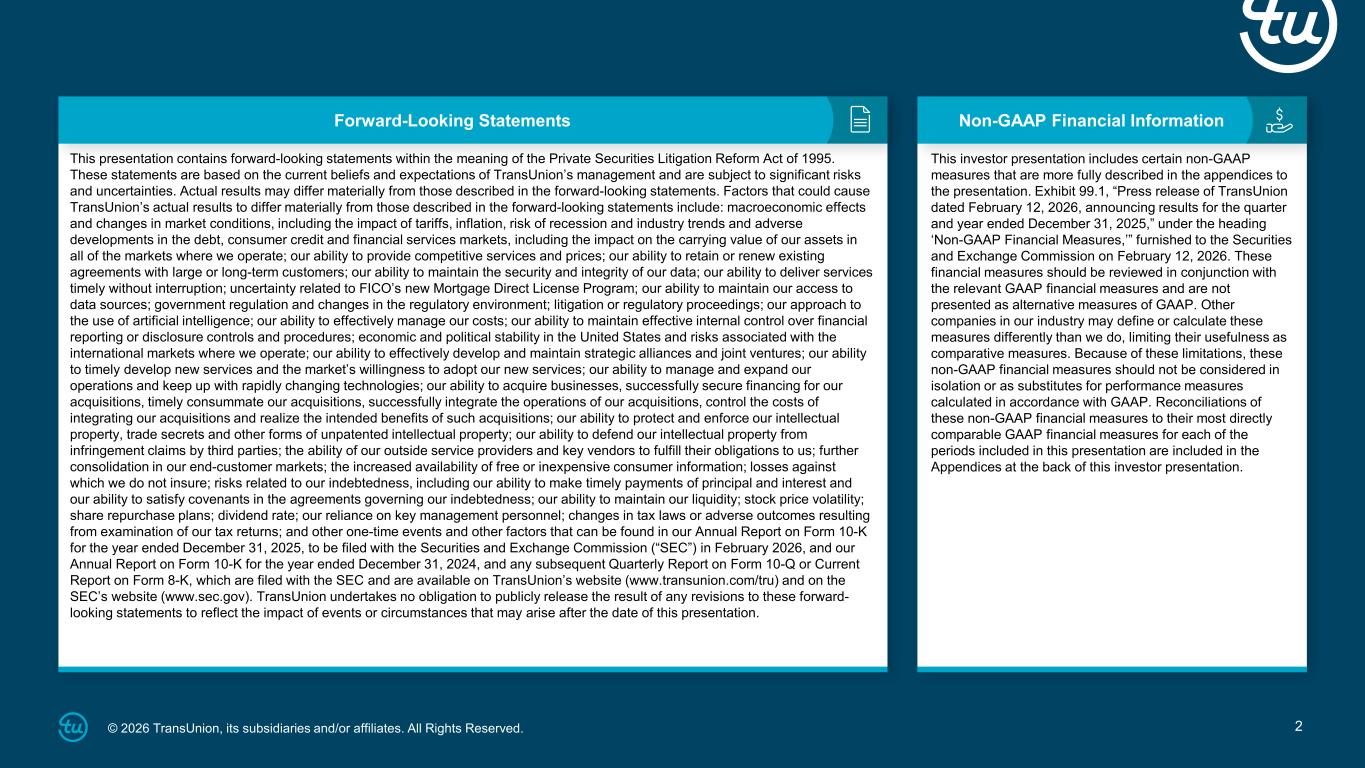 2© 2026 TransUnion, its subsidiaries and/or affiliates. All Rights Reserved. Non-GAAP Financial InformationForward-Looking Statements This presentation contains forward-looking statements within the meaning of the Private Securities Litigation Reform Act of 1995. These statements are based on the current beliefs and expectations of TransUnion’s management and are subject to significant risks and uncertainties. Actual results may differ materially from those described in the forward-looking statements. Factors that could cause TransUnion’s actual results to differ materially from those described in the forward-looking statements include: macroeconomic effects and changes in market conditions, including the impact of tariffs, inflation, risk of recession and industry trends and adverse developments in the debt, consumer credit and financial services markets, including the impact on the carrying value of our assets in all of the markets where we operate; our ability to provide competitive services and prices; our ability to retain or renew existing agreements with large or long-term customers; our ability to maintain the security and integrity of our data; our ability to deliver services timely without interruption; uncertainty related to FICO’s new Mortgage Direct License Program; our ability to maintain our access to data sources; government regulation and changes in the regulatory environment; litigation or regulatory proceedings; our approach to the use of artificial intelligence; our ability to effectively manage our costs; our ability to maintain effective internal control over financial reporting or disclosure controls and procedures; economic and political stability in the United States and risks associated with the international markets where we operate; our ability to effectively develop and maintain strategic alliances and joint ventures; our ability to timely develop new services and the market’s willingness to adopt our new services; our ability to manage and expand our operations and keep up with rapidly changing technologies; our ability to acquire businesses, successfully secure financing for our acquisitions, timely consummate our acquisitions, successfully integrate the operations of our acquisitions, control the costs of integrating our acquisitions and realize the intended benefits of such acquisitions; our ability to protect and enforce our intellectual property, trade secrets and other forms of unpatented intellectual property; our ability to defend our intellectual property from infringement claims by third parties; the ability of our outside service providers and key vendors to fulfill their obligations to us; further consolidation in our end-customer markets; the increased availability of free or inexpensive consumer information; losses against which we do not insure; risks related to our indebtedness, including our ability to make timely payments of principal and interest and our ability to satisfy covenants in the agreements governing our indebtedness; our ability to maintain our liquidity; stock price volatility; share repurchase plans; dividend rate; our reliance on key management personnel; changes in tax laws or adverse outcomes resulting from examination of our tax returns; and other one-time events and other factors that can be found in our Annual Report on Form 10-K for the year ended December 31, 2025, to be filed with the Securities and Exchange Commission (“SEC”) in February 2026, and our Annual Report on Form 10-K for the year ended December 31, 2024, and any subsequent Quarterly Report on Form 10-Q or Current Report on Form 8-K, which are filed with the SEC and are available on TransUnion’s website (www.transunion.com/tru) and on the SEC’s website (www.sec.gov). TransUnion undertakes no obligation to publicly release the result of any revisions to these forward- looking statements to reflect the impact of events or circumstances that may arise after the date of this presentation. This investor presentation includes certain non-GAAP measures that are more fully described in the appendices to the presentation. Exhibit 99.1, “Press release of TransUnion dated February 12, 2026, announcing results for the quarter and year ended December 31, 2025,” under the heading ‘Non-GAAP Financial Measures,’” furnished to the Securities and Exchange Commission on February 12, 2026. These financial measures should be reviewed in conjunction with the relevant GAAP financial measures and are not presented as alternative measures of GAAP. Other companies in our industry may define or calculate these measures differently than we do, limiting their usefulness as comparative measures. Because of these limitations, these non-GAAP financial measures should not be considered in isolation or as substitutes for performance measures calculated in accordance with GAAP. Reconciliations of these non-GAAP financial measures to their most directly comparable GAAP financial measures for each of the periods included in this presentation are included in the Appendices at the back of this investor presentation.