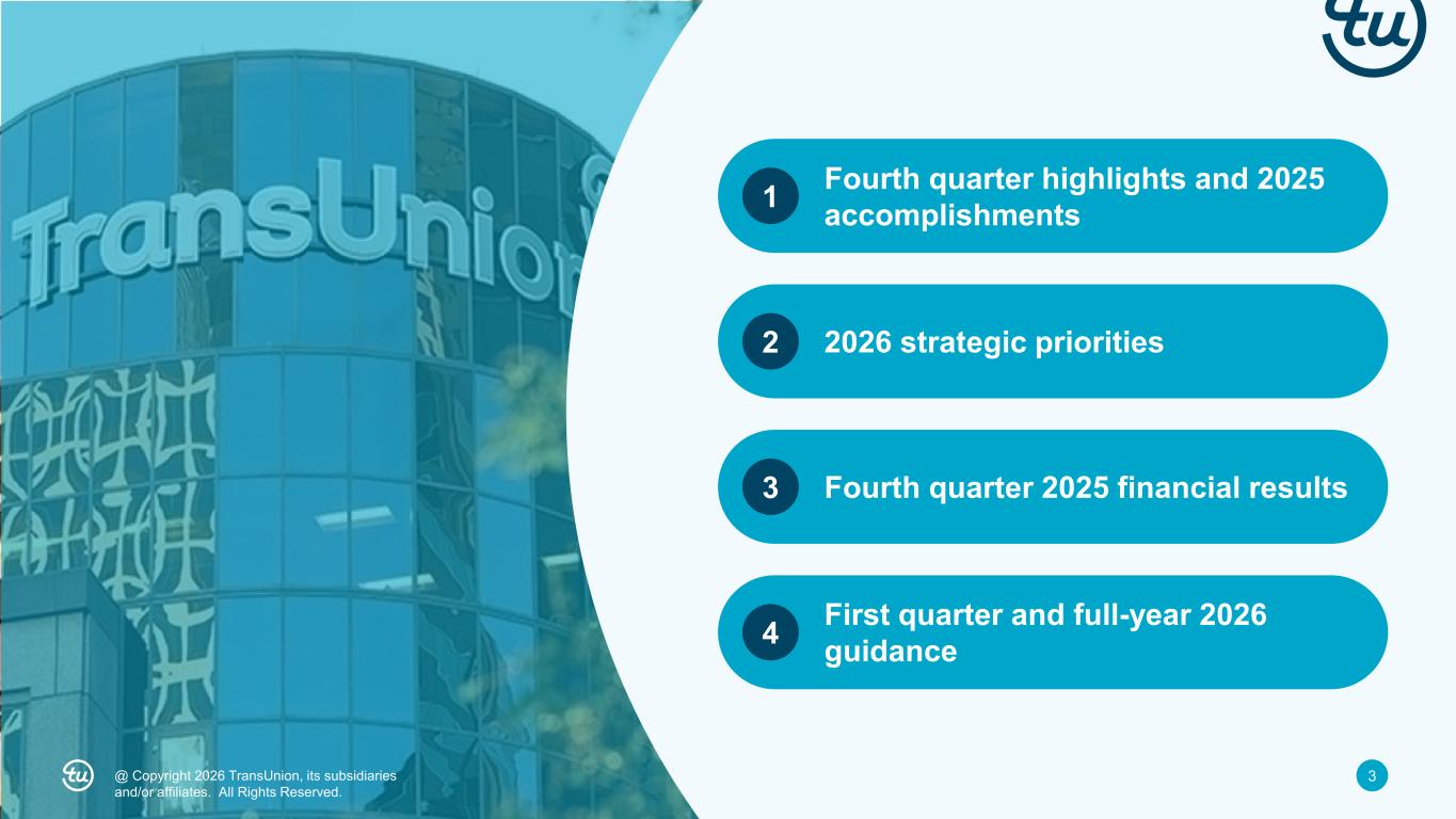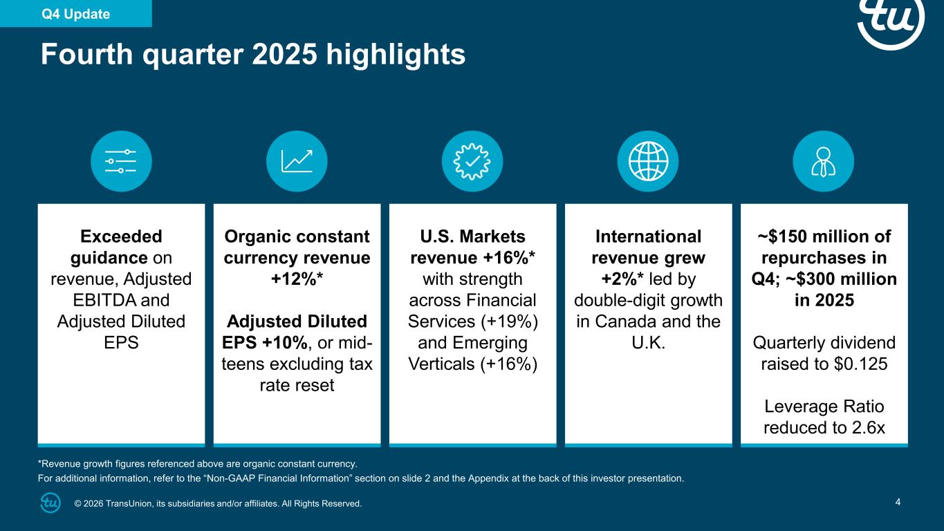 3© 2026 TransUnion, its subsidiaries and/or affiliates. All Rights Reserved. Fourth quarter highlights and 2025 accomplishments1 2026 strategic priorities2 3@ Copyright 2026 Tran Union, its ubsidiaries and/or affiliates. All Rights Reserved. Fourth quarter 2025 financial results3 First quarter and full-year 2026 guidance4