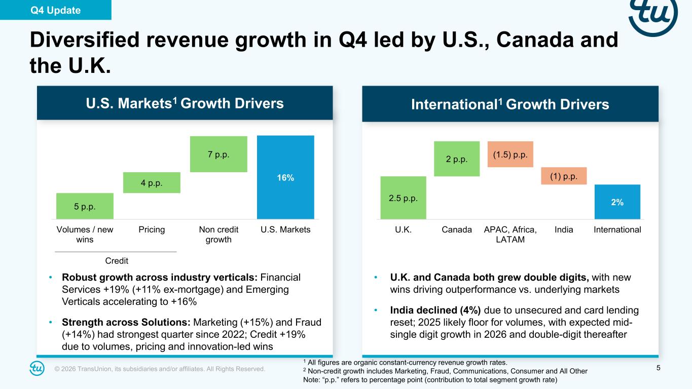 4© 2026 TransUnion, its subsidiaries and/or affiliates. All Rights Reserved. *Revenue growth figures referenced above are organic constant currency. International revenue grew +2%* led by double-digit growth in Canada and the U.K. U.S. Markets revenue +16%* with strength across Financial Services (+19%) and Emerging Verticals (+16%) Organic constant currency revenue +12%* Adjusted Diluted EPS +10%, or mid- teens excluding tax rate reset Exceeded guidance on revenue, Adjusted EBITDA and Adjusted Diluted EPS ~$150 million of repurchases in Q4; ~$300 million in 2025 Quarterly dividend raised to $0.125 Leverage Ratio reduced to 2.6x For additional information, refer to the “Non-GAAP Financial Information” section on slide 2 and the Appendix at the back of this investor presentation. Fourth quarter 2025 highlights Q4 Update
