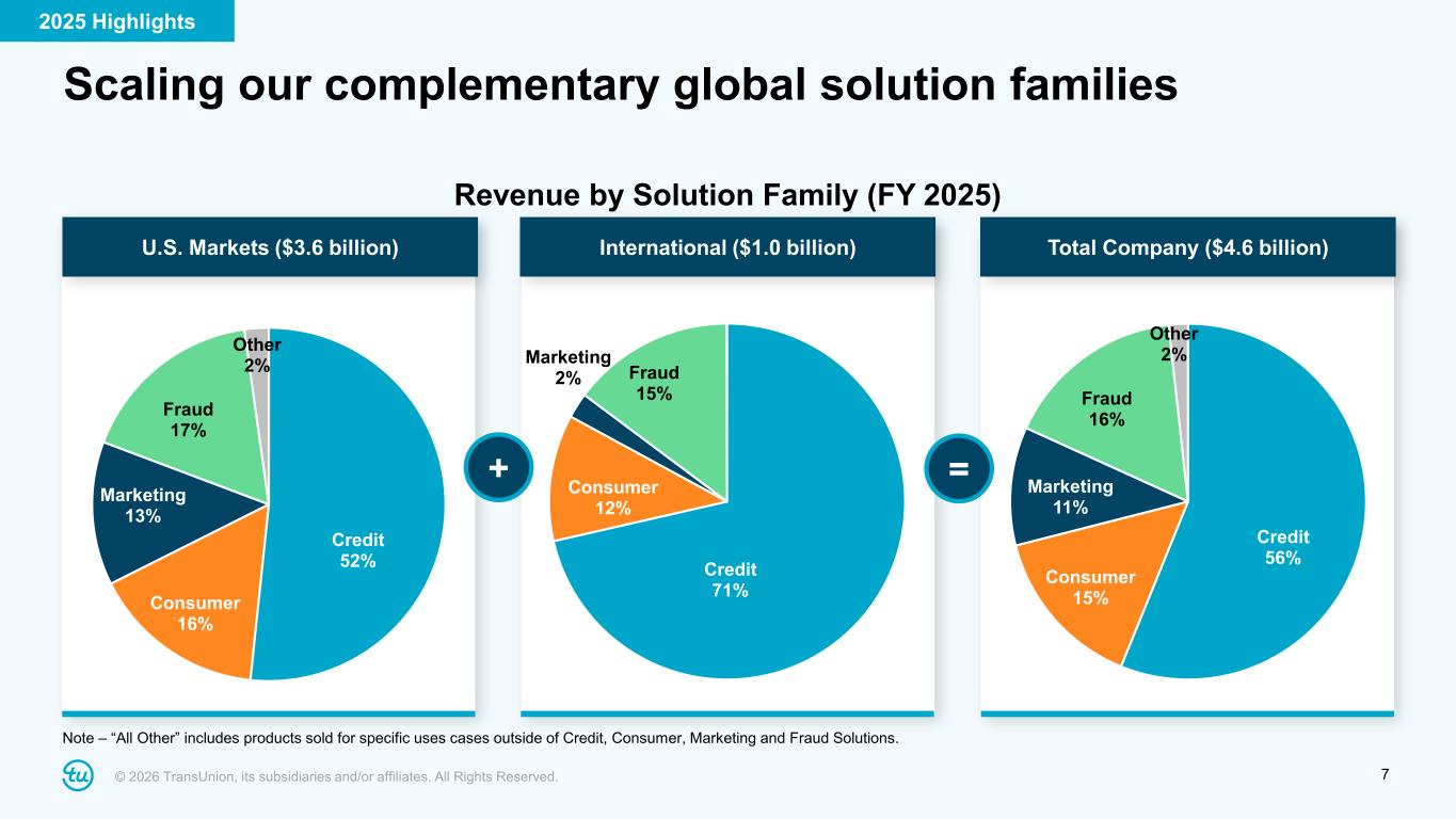 © 2026 TransUnion, its subsidiaries and/or affiliates. All Rights Reserved. 6 Strong results in 2025 enabled accretive capital deployment +9% Organic constant currency revenue growth +$183 million above high-end of February 2025 guidance 8 straight quarters of at least high- single digit growth Strength across Credit (+13%), Fraud (+8%) and Marketing (+7%) 36.0% Adjusted EBITDA Margin +$56 million above high-end of February 2025 guidance +50bps expansion excluding FICO mortgage royalty impact Transformation program completed on budget with committed savings +10% Adjusted Diluted EPS growth +$0.22 above high-end of February 2025 guidance +14% growth excluding 400bps impact from tax rate reset ~$390 million cash returned to shareholders via repurchases and dividends 2.6x Leverage Ratio (vs. 3.0x at year-end 2024) Trans Union de Mexico acquisition expected to close in H1 2026 2025 Highlights For additional information, refer to the “Non-GAAP Financial Information” section on slide 2 and the Appendix at the back of this investor presentation.