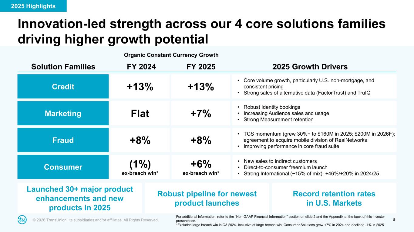 © 2026 TransUnion, its subsidiaries and/or affiliates. All Rights Reserved. 7 Credit 56% Consumer 15% Marketing 11% Fraud 16% Other 2% Credit 52% Consumer 16% Marketing 13% Fraud 17% Other 2% Credit 71% Consumer 12% Marketing 2% Fraud 15% + = Scaling our complementary global solution families U.S. Markets ($3.6 billion) International ($1.0 billion) Total Company ($4.6 billion) Note – “All Other” includes products sold for specific uses cases outside of Credit, Consumer, Marketing and Fraud Solutions. Revenue by Solution Family (FY 2025) 2025 Highlights