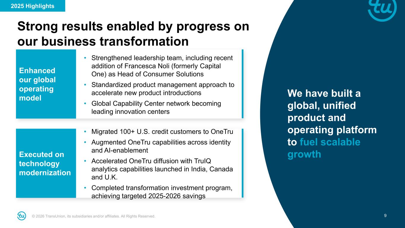 © 2026 TransUnion, its subsidiaries and/or affiliates. All Rights Reserved. 8 Solution Families Organic Constant Currency Growth 2025 Growth Drivers Innovation-led strength across our 4 core solutions families driving higher growth potential For additional information, refer to the “Non-GAAP Financial Information” section on slide 2 and the Appendix at the back of this investor presentation. *Excludes large breach win in Q3 2024. Inclusive of large breach win, Consumer Solutions grew +7% in 2024 and declined -1% in 2025 (1%) ex-breach win* Consumer • New sales to indirect customers • Direct-to-consumer freemium launch • Strong International (~15% of mix); +46%/+20% in 2024/25 +6% ex-breach win* +8%Fraud • TCS momentum (grew 30%+ to $160M in 2025; $200M in 2026F); agreement to acquire mobile division of RealNetworks • Improving performance in core fraud suite +8% FlatMarketing • Robust Identity bookings • Increasing Audience sales and usage • Strong Measurement retention +7% +13%Credit • Core volume growth, particularly U.S. non-mortgage, and consistent pricing • Strong sales of alternative data (FactorTrust) and TruIQ +13% FY 2024 FY 2025 Launched 30+ major product enhancements and new products in 2025 Robust pipeline for newest product launches Record retention rates in U.S. Markets 2025 Highlights