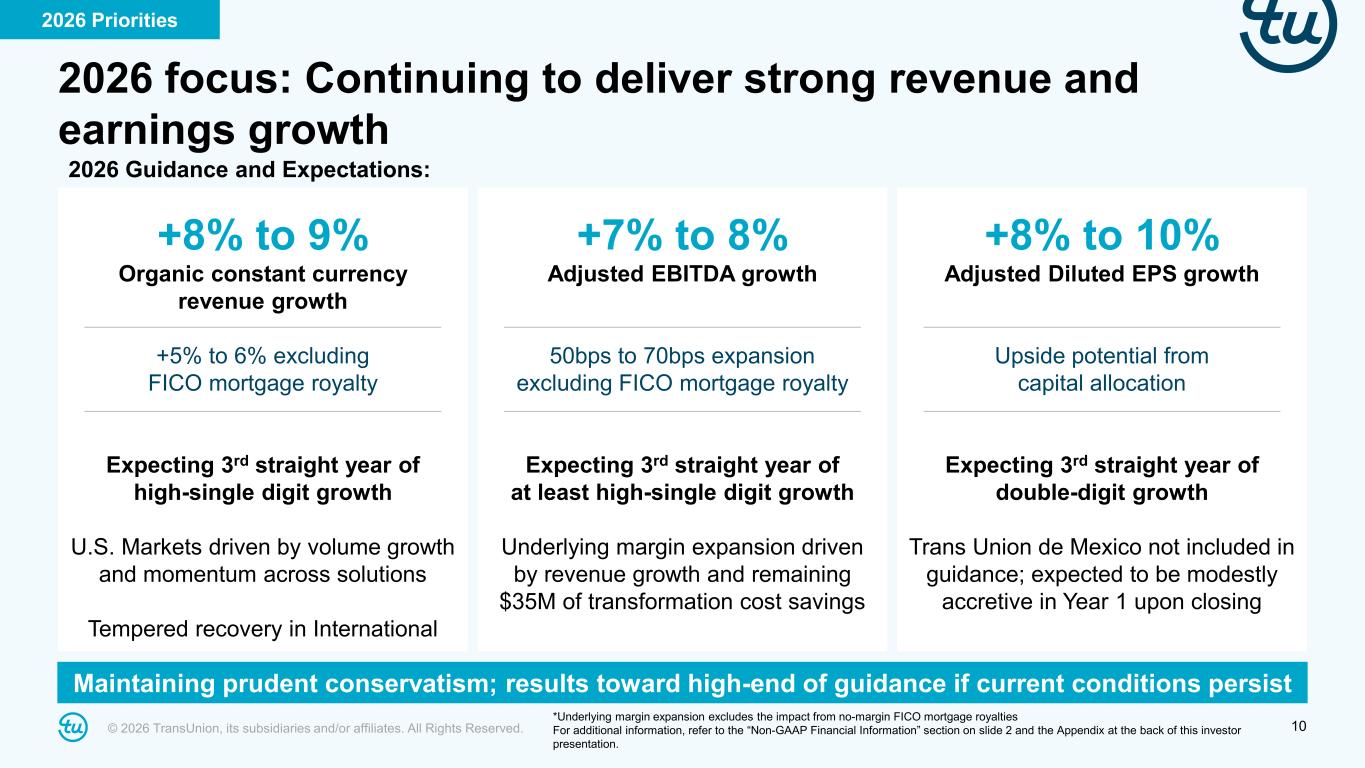 © 2026 TransUnion, its subsidiaries and/or affiliates. All Rights Reserved. 9 Strong results enabled by progress on our business transformation We have built a global, unified product and operating platform to fuel scalable growth • Strengthened leadership team, including recent addition of Francesca Noli (formerly Capital One) as Head of Consumer Solutions • Standardized product management approach to accelerate new product introductions • Global Capability Center network becoming leading innovation centers • Migrated 100+ U.S. credit customers to OneTru • Augmented OneTru capabilities across identity and AI-enablement • Accelerated OneTru diffusion with TruIQ analytics capabilities launched in India, Canada and U.K. • Completed transformation investment program, achieving targeted 2025-2026 savings Enhanced our global operating model Executed on technology modernization 2025 Highlights