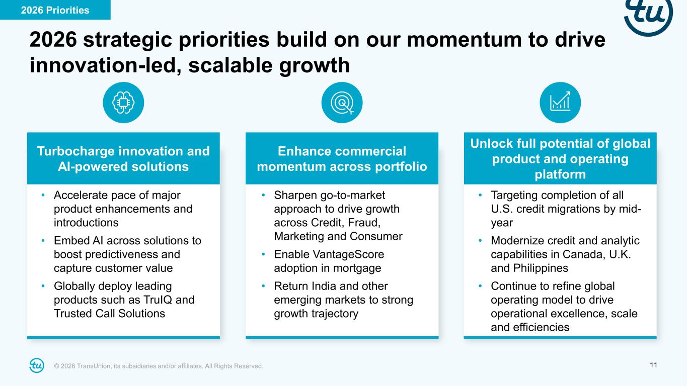 © 2026 TransUnion, its subsidiaries and/or affiliates. All Rights Reserved. 10 2026 focus: Continuing to deliver strong revenue and earnings growth +8% to 9% Organic constant currency revenue growth +5% to 6% excluding FICO mortgage royalty Expecting 3rd straight year of high-single digit growth U.S. Markets driven by volume growth and momentum across solutions Tempered recovery in International +7% to 8% Adjusted EBITDA growth 50bps to 70bps expansion excluding FICO mortgage royalty Expecting 3rd straight year of at least high-single digit growth Underlying margin expansion driven by revenue growth and remaining $35M of transformation cost savings +8% to 10% Adjusted Diluted EPS growth Upside potential from capital allocation Expecting 3rd straight year of double-digit growth Trans Union de Mexico not included in guidance; expected to be modestly accretive in Year 1 upon closing Maintaining prudent conservatism; results toward high-end of guidance if current conditions persist 2026 Priorities *Underlying margin expansion excludes the impact from no-margin FICO mortgage royalties For additional information, refer to the “Non-GAAP Financial Information” section on slide 2 and the Appendix at the back of this investor presentation. 2026 Guidance and Expectations: