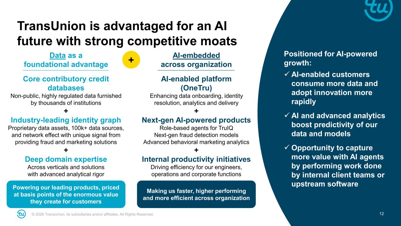 © 2026 TransUnion, its subsidiaries and/or affiliates. All Rights Reserved. 11 • Accelerate pace of major product enhancements and introductions • Embed AI across solutions to boost predictiveness and capture customer value • Globally deploy leading products such as TruIQ and Trusted Call Solutions Turbocharge innovation and AI-powered solutions 2026 strategic priorities build on our momentum to drive innovation-led, scalable growth Enhance commercial momentum across portfolio Unlock full potential of global product and operating platform • Sharpen go-to-market approach to drive growth across Credit, Fraud, Marketing and Consumer • Enable VantageScore adoption in mortgage • Return India and other emerging markets to strong growth trajectory • Targeting completion of all U.S. credit migrations by mid- year • Modernize credit and analytic capabilities in Canada, U.K. and Philippines • Continue to refine global operating model to drive operational excellence, scale and efficiencies 2026 Priorities