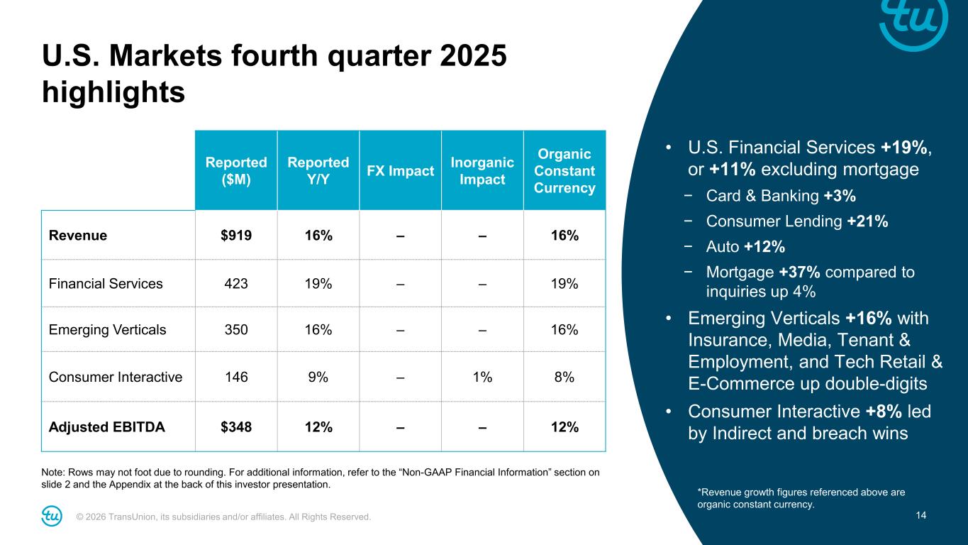 © 2026 TransUnion, its subsidiaries and/or affiliates. All Rights Reserved. 13 Consolidated fourth quarter 2025 highlights For additional information, refer to the “Non-GAAP Financial Information” section on slide 2 and the Appendix at the back of this investor presentation. Reported ($M) Y/Y Change Revenue $1,171 13% Organic Constant Currency Revenue 12% Adjusted EBITDA $417 10% Adjusted EBITDA Margin 35.6% (90)bps Adjusted Diluted EPS $1.07 10% • 8th straight quarter of at least high-single digit organic constant currency revenue growth • Organic constant currency revenue growth of +12%, or +9% excluding mortgage • Adjusted EBITDA increased +10% with revenue flow- through balanced against growth investments