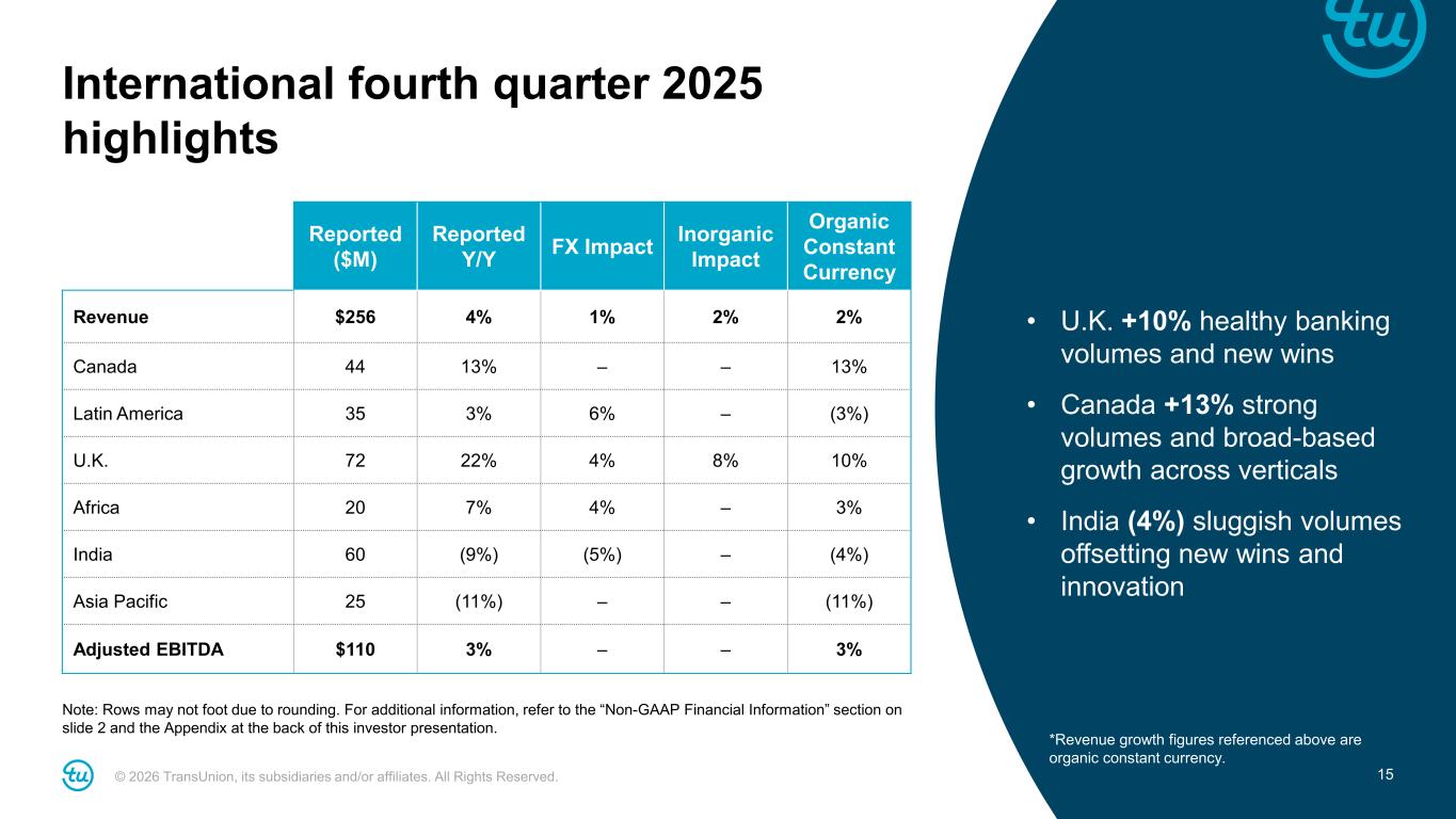 © 2026 TransUnion, its subsidiaries and/or affiliates. All Rights Reserved. 14 U.S. Markets fourth quarter 2025 highlights Note: Rows may not foot due to rounding. For additional information, refer to the “Non-GAAP Financial Information” section on slide 2 and the Appendix at the back of this investor presentation. • U.S. Financial Services +19%, or +11% excluding mortgage − Card & Banking +3% − Consumer Lending +21% − Auto +12% − Mortgage +37% compared to inquiries up 4% • Emerging Verticals +16% with Insurance, Media, Tenant & Employment, and Tech Retail & E-Commerce up double-digits • Consumer Interactive +8% led by Indirect and breach wins Reported ($M) Reported Y/Y FX Impact Inorganic Impact Organic Constant Currency Revenue $919 16% – – 16% Financial Services 423 19% – – 19% Emerging Verticals 350 16% – – 16% Consumer Interactive 146 9% – 1% 8% Adjusted EBITDA $348 12% – – 12% *Revenue growth figures referenced above are organic constant currency.