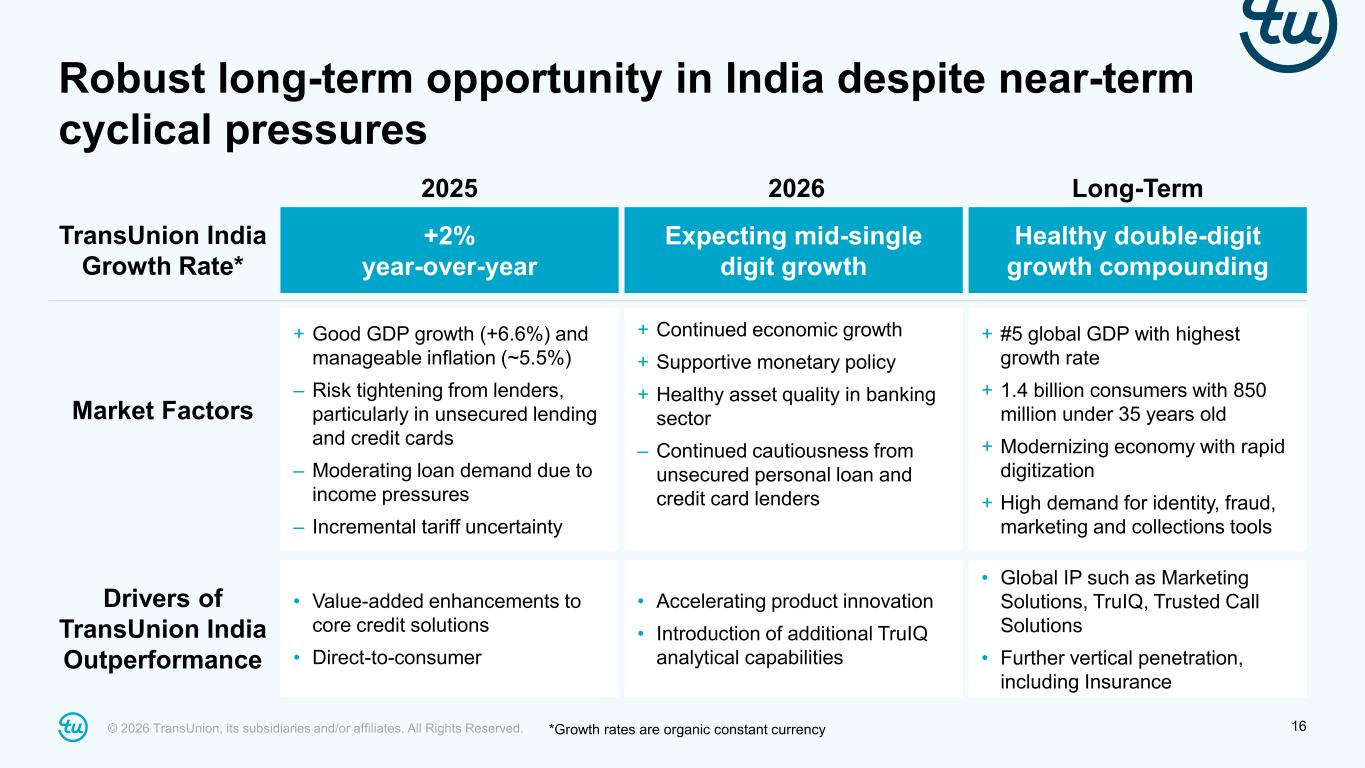 © 2026 TransUnion, its subsidiaries and/or affiliates. All Rights Reserved. 15 International fourth quarter 2025 highlights Note: Rows may not foot due to rounding. For additional information, refer to the “Non-GAAP Financial Information” section on slide 2 and the Appendix at the back of this investor presentation. Reported ($M) Reported Y/Y FX Impact Inorganic Impact Organic Constant Currency Revenue $256 4% 1% 2% 2% Canada 44 13% – – 13% Latin America 35 3% 6% – (3%) U.K. 72 22% 4% 8% 10% Africa 20 7% 4% – 3% India 60 (9%) (5%) – (4%) Asia Pacific 25 (11%) – – (11%) Adjusted EBITDA $110 3% – – 3% *Revenue growth figures referenced above are organic constant currency. • U.K. +10% healthy banking volumes and new wins • Canada +13% strong volumes and broad-based growth across verticals • India (4%) sluggish volumes offsetting new wins and innovation