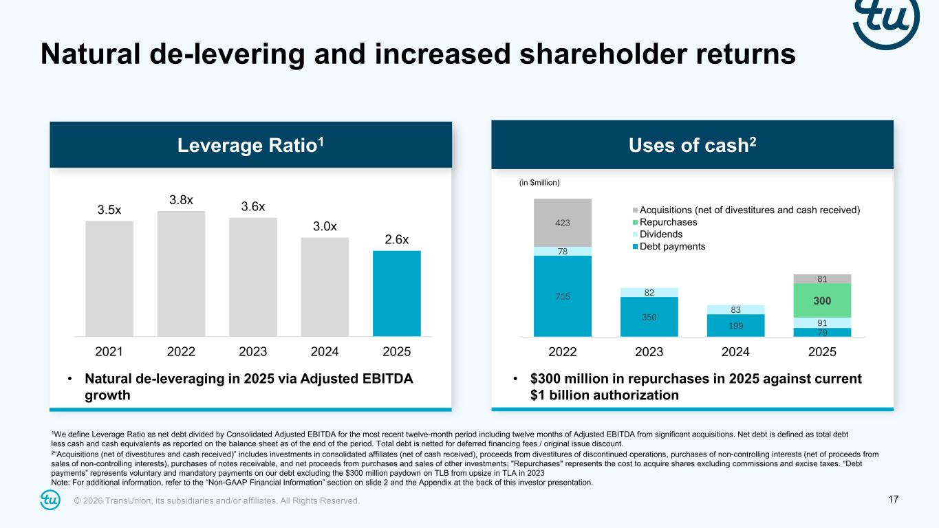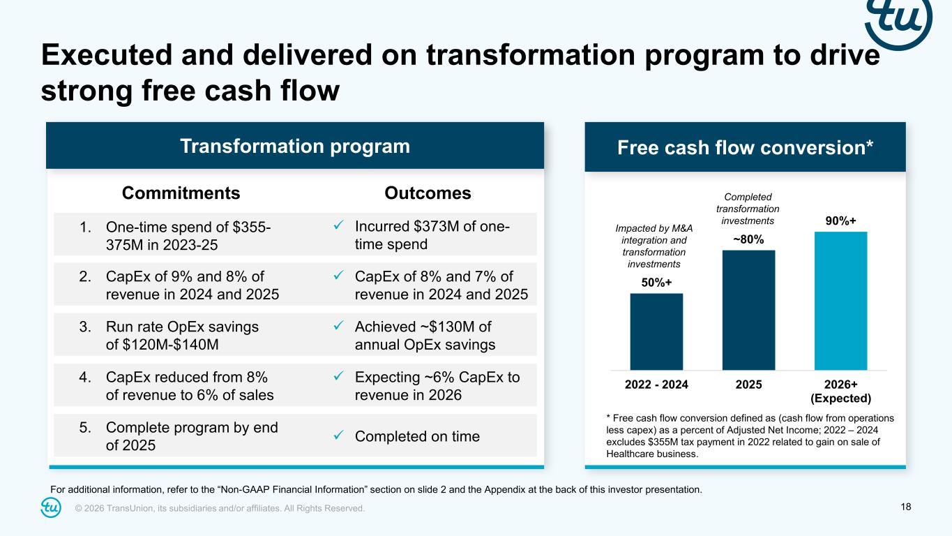 © 2026 TransUnion, its subsidiaries and/or affiliates. All Rights Reserved. 17 Natural de-levering and increased shareholder returns Uses of cash2 Leverage Ratio1 1We define Leverage Ratio as net debt divided by Consolidated Adjusted EBITDA for the most recent twelve-month period including twelve months of Adjusted EBITDA from significant acquisitions. Net debt is defined as total debt less cash and cash equivalents as reported on the balance sheet as of the end of the period. Total debt is netted for deferred financing fees / original issue discount.​ 2“Acquisitions (net of divestitures and cash received)” includes investments in consolidated affiliates (net of cash received), proceeds from divestitures of discontinued operations, purchases of non-controlling interests (net of proceeds from sales of non-controlling interests), purchases of notes receivable, and net proceeds from purchases and sales of other investments; "Repurchases" represents the cost to acquire shares excluding commissions and excise taxes. “Debt payments” represents voluntary and mandatory payments on our debt excluding the $300 million paydown on TLB from upsize in TLA in 2023 Note: For additional information, refer to the “Non-GAAP Financial Information” section on slide 2 and the Appendix at the back of this investor presentation. 3.5x 3.8x 3.6x 3.0x 2.6x 2021 2022 2023 2024 2025 715 350 199 79 78 82 83 91 300 423 81 2022 2023 2024 2025 Acquisitions (net of divestitures and cash received) Repurchases Dividends Debt payments (in $million) • $300 million in repurchases in 2025 against current $1 billion authorization • Natural de-leveraging in 2025 via Adjusted EBITDA growth
