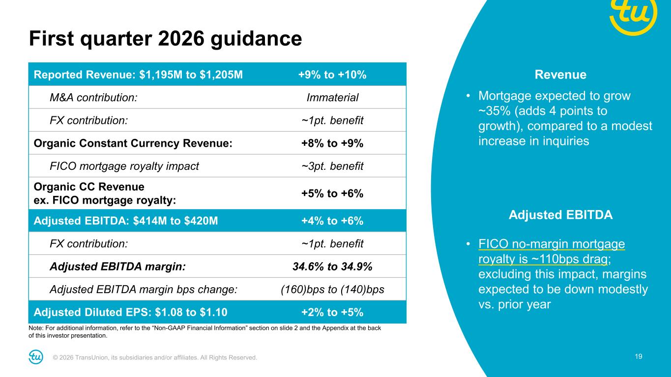 © 2026 TransUnion, its subsidiaries and/or affiliates. All Rights Reserved. 18 50%+ ~80% 90%+ 2022 - 2024 2025 2026+ (Expected) Executed and delivered on transformation program to drive strong free cash flow For additional information, refer to the “Non-GAAP Financial Information” section on slide 2 and the Appendix at the back of this investor presentation. Free cash flow conversion* * Free cash flow conversion defined as (cash flow from operations less capex) as a percent of Adjusted Net Income; 2022 – 2024 excludes $355M tax payment in 2022 related to gain on sale of Healthcare business. Transformation program Impacted by M&A integration and transformation investments Completed transformation investments OutcomesCommitments 1. One-time spend of $355- 375M in 2023-25 5. Complete program by end of 2025 3. Run rate OpEx savings of $120M-$140M 4. CapEx reduced from 8% of revenue to 6% of sales  Incurred $373M of one- time spend  Completed on time  Achieved ~$130M of annual OpEx savings  Expecting ~6% CapEx to revenue in 2026 2. CapEx of 9% and 8% of revenue in 2024 and 2025  CapEx of 8% and 7% of revenue in 2024 and 2025