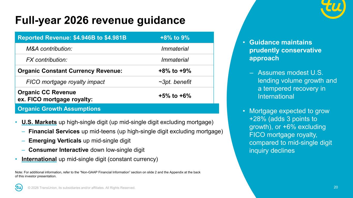 © 2026 TransUnion, its subsidiaries and/or affiliates. All Rights Reserved. 19 Reported Revenue: $1,195M to $1,205M +9% to +10% M&A contribution: Immaterial FX contribution: ~1pt. benefit Organic Constant Currency Revenue: +8% to +9% FICO mortgage royalty impact ~3pt. benefit Organic CC Revenue ex. FICO mortgage royalty: +5% to +6% Adjusted EBITDA: $414M to $420M +4% to +6% FX contribution: ~1pt. benefit Adjusted EBITDA margin: 34.6% to 34.9% Adjusted EBITDA margin bps change: (160)bps to (140)bps Adjusted Diluted EPS: $1.08 to $1.10 +2% to +5% First quarter 2026 guidance Note: For additional information, refer to the “Non-GAAP Financial Information” section on slide 2 and the Appendix at the back of this investor presentation. Revenue • Mortgage expected to grow ~35% (adds 4 points to growth), compared to a modest increase in inquiries Adjusted EBITDA • FICO no-margin mortgage royalty is ~110bps drag; excluding this impact, margins expected to be down modestly vs. prior year