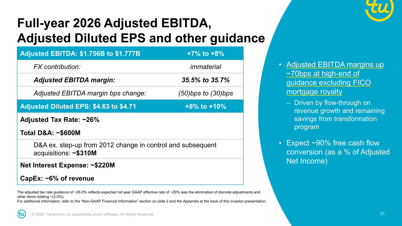 © 2026 TransUnion, its subsidiaries and/or affiliates. All Rights Reserved. 20 • Guidance maintains prudently conservative approach – Assumes modest U.S. lending volume growth and a tempered recovery in International • Mortgage expected to grow +28% (adds 3 points to growth), or +6% excluding FICO mortgage royalty, compared to mid-single digit inquiry declines Full-year 2026 revenue guidance Reported Revenue: $4.946B to $4.981B +8% to 9% M&A contribution: Immaterial FX contribution: Immaterial Organic Constant Currency Revenue: +8% to +9% FICO mortgage royalty impact ~3pt. benefit Organic CC Revenue ex. FICO mortgage royalty: +5% to +6% Organic Growth Assumptions • U.S. Markets up high-single digit (up mid-single digit excluding mortgage) – Financial Services up mid-teens (up high-single digit excluding mortgage) – Emerging Verticals up mid-single digit – Consumer Interactive down low-single digit • International up mid-single digit (constant currency) Note: For additional information, refer to the “Non-GAAP Financial Information” section on slide 2 and the Appendix at the back of this investor presentation.