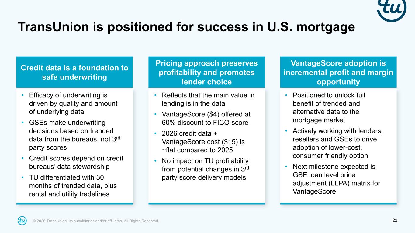 © 2026 TransUnion, its subsidiaries and/or affiliates. All Rights Reserved. 21 The adjusted tax rate guidance of ~26.0% reflects expected full year GAAP effective rate of ~29% less the elimination of discrete adjustments and other items totaling ~(3.0%). For additional information, refer to the “Non-GAAP Financial Information” section on slide 2 and the Appendix at the back of this investor presentation. Full-year 2026 Adjusted EBITDA, Adjusted Diluted EPS and other guidance Adjusted EBITDA: $1.756B to $1.777B +7% to +8% FX contribution: immaterial Adjusted EBITDA margin: 35.5% to 35.7% Adjusted EBITDA margin bps change: (50)bps to (30)bps Adjusted Diluted EPS: $4.63 to $4.71 +8% to +10% Adjusted Tax Rate: ~26% Total D&A: ~$600M D&A ex. step-up from 2012 change in control and subsequent acquisitions: ~$310M Net Interest Expense: ~$220M CapEx: ~6% of revenue • Adjusted EBITDA margins up ~70bps at high-end of guidance excluding FICO mortgage royalty – Driven by flow-through on revenue growth and remaining savings from transformation program • Expect ~90% free cash flow conversion (as a % of Adjusted Net Income)